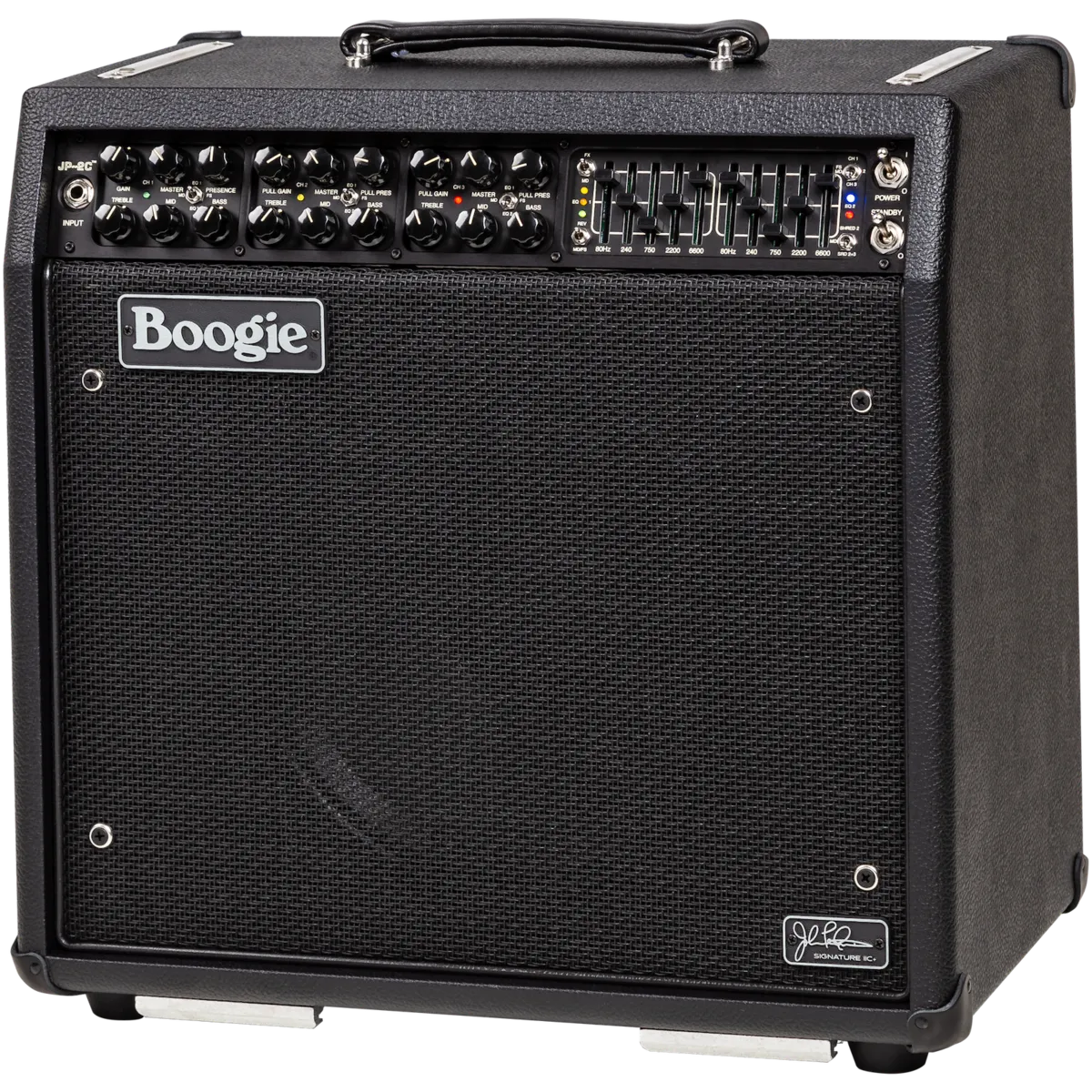 Much like a race car or fighter jet, the JP-2C strips down to bare essentials to get the job done effectively and in the simplest way. It's a purpose-built, no-compromise rendering that aims at one single goal; provide the most aggressive, purest sounding lIC+ in a versatile package that delivers the goods to meet John's recording and stage needs. The JP-2C offers the highest headroom Clean sounds of any Mark Series amp, one Boogie Lead Channel for tight, grinding rhythm work, and a slightly higher gain Boogie® Lead Channel, with access to even more saturation yet the ability to track any technique and speed while also reaching to the stratosphere for single note solos. In that spirit, unlike other MESA amplifiers, the JP-2C foregoes the concept of multiple voicing Modes per channel and instead dedicates each of the three Channels exclusively to one of two voicings from the MARK IIC+. In Channels 2 and 3, it also adds a SHRED Mode, which further enhances the top-end harmonic layering of the original lIC+ Lead Circuit.