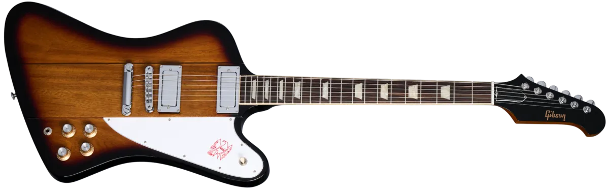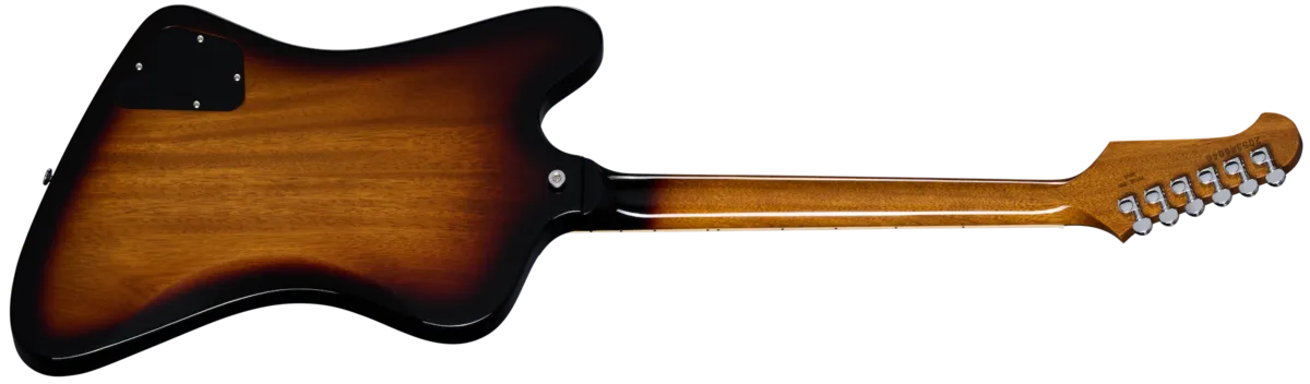 In early 1965, the original Firebird ™ design transitioned through several different iterations. One of the significant transitions that occurred flipped the headstock to the "Non-Reverse" shape. Unlike the original Reverse design, which featured a two-layered headstock with a holly veneer, the new headstock was flat, like the bill of a platypus. The Platypus-style Firebird featured six-in-line tuners rather than banjo-style, as seen on previous Firebirds. The Firebird Platypus pays tribute to those rare transitional models. It features a mahogany body with a glued-in, set neck and the appearance of traditional neck-through Reverse Firebird body. The mahogany neck has a SlimTaper™ profile and a rosewood fretboard and sports the Platypus-style headstock with Grover® Mini Rotomatic® tuners. The Platypus-style headstock has been slightly modified to provide straight string pull for less friction and improved tuning stability. The Firebird is one of the most distinctive-looking guitar designs ever, and the Firebird Platypus takes this legendary guitar a step further with its unique appearance. Its tone is just as unique due to its two articulate, historically accurate Firebird mini humbucker™ pickups with Alnico 5 magnets that can deliver nearly bell-like chime when played clean and great rock and blues tones that easily cut through the mix when pushed. Individual volume and tone controls allow you to tailor the sound even further, and of course, the pickguard features the legendary hot-stamped Firebird graphic. A hardshell case is also included.