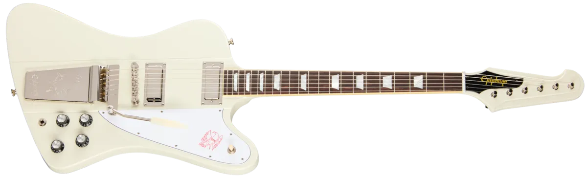 Epiphone and Gibson ™ Custom have teamed up once again to create the updated Inspired by Gibson Custom 1963 Firebird V Reissue with Maestro Vibrola- an authentic replica of the guitar designed by legendary automotive designer Ray Dietrich. When it was launched in 1963, the Firebird ™ was Gibson's first neck-through-body guitar, and it went on to be used by players in a wide range of genres, including blues legend Johnny Winter, Keith Richards and Brian Jones of The Rolling Stones, Eric Clapton, and Phil Manzanera of Roxy Music, to name a few. The updated Epiphone Inspired by Gibson Custom 1963 Firebird V with Maestro Vibrola delivers vintage Firebird specifications at an accessible price. The vintage-inspired features include a 9-ply neck-through-body made of mahogany and walnut with mahogany body wings to either side of the neck. This construction method results in the tuners, pickup, and bridge all being anchored into the same pieces of wood for exceptional resonance, sustain, and tonal transfer between them. The neck features a Slim Taper ™ Rounded C profile with soft fretboard edges for a comfortable, played-in feel. The rosewood fretboard is adorned with mother-of-pearl trapezoid inlays and equipped with 22 medium jumbo frets. Even the side dot position markers are the same size as on vintage Firebirds and placed in historically accurate locations. Kluson® planetary geared "banjo" tuners anchor the strings at the headstock and further add to the historic Firebird look, while an Epiphone ABR-1 bridge and Maestro™ Vibrola™ with an engraved Epiphone logo hold things down at the other end. The electronics are also premium and include Gibson USA Firebird mini humbucker™ pickups with Alnico 5 magnets, CTS® potentiometers, Mallory ™ capacitors, and a Switchcraft® 3-way pickup selector toggle switch and 1/4" output jack, giving this remarkable recreation not only the look but also the sound of a classic Firebird V. An Epiphone Inspired by Gibson Custom hardshell case is also included.