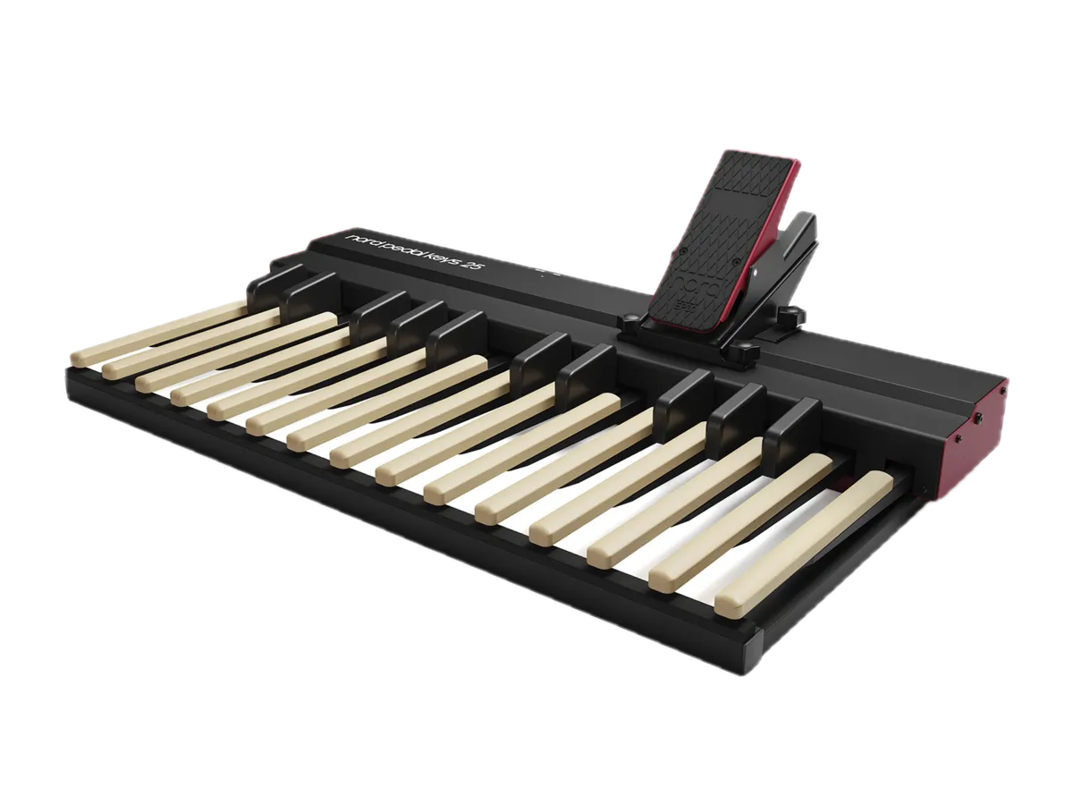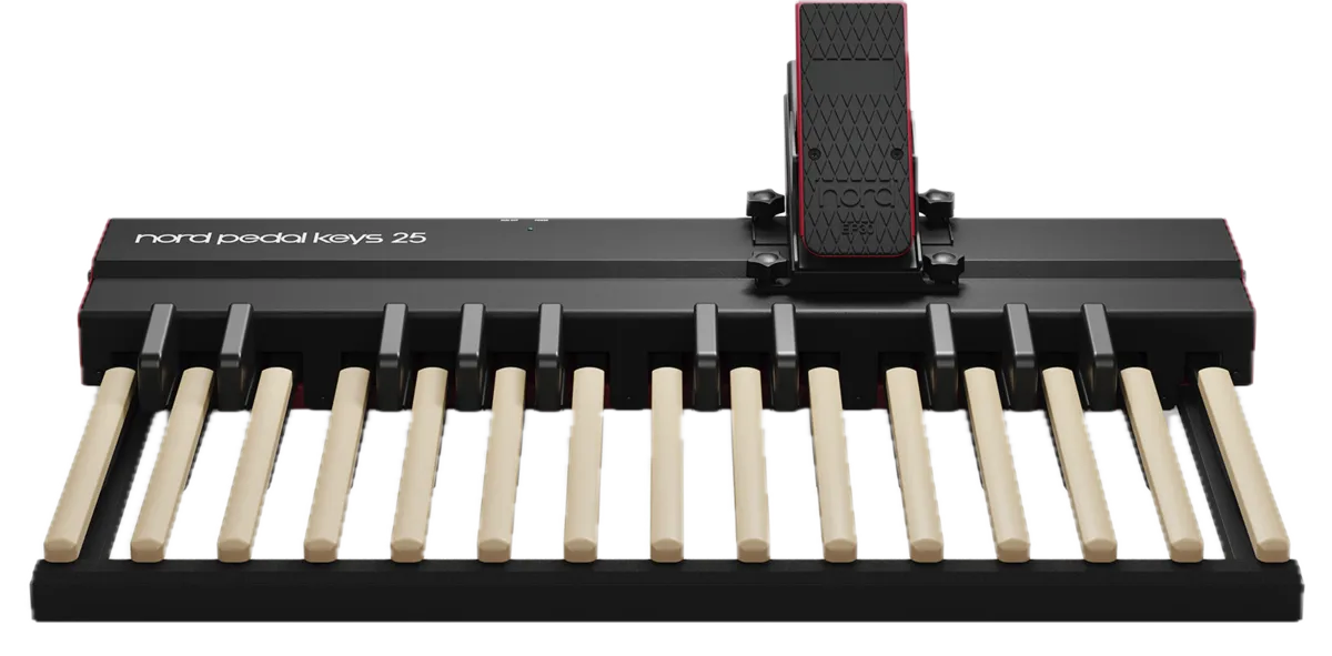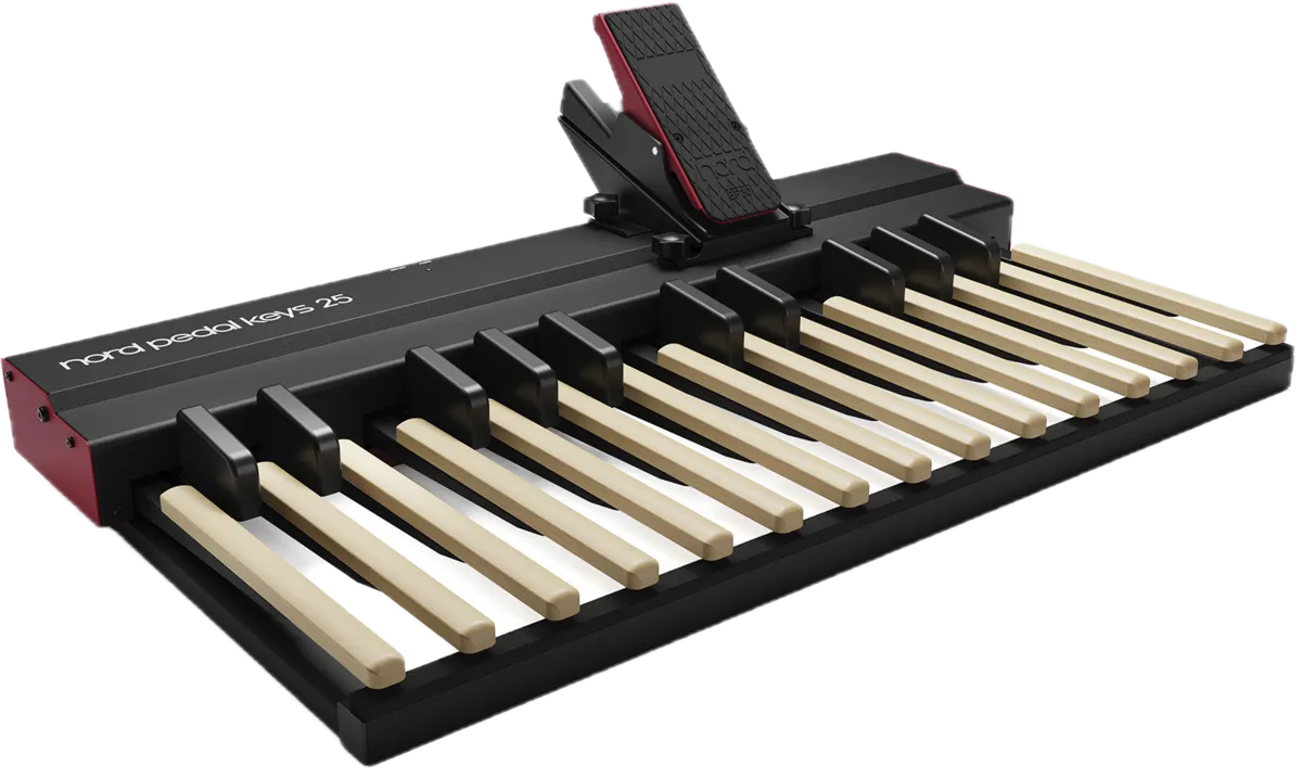 Our next-generation MIDI pedal keyboard features 25 wooden keys and includes the Nord EP30 swell pedal, complete with a dedicated mounting bracket for convenient attachment. The entire unit is built into a rugged yet lightweight aluminum chassis, offering durability without compromising portability.