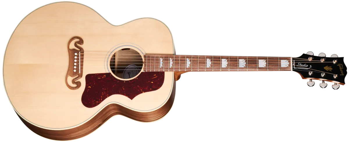 The Gibson SJ-200 ™ was first introduced in 1937 as the Super Jumbo. With its Super Jumbo body size and excellent projection, the SJ-200 still makes an undeniable statement like no other acoustic guitar. From country to folk, Americana to rock 'n' roll, countless musical icons have picked the SJ-200 to make some of the world's most beloved music. Now, Gibson is proud to introduce the updated SJ-200 Studio Walnut. The SJ-200 Studio Walnut is handcrafted in Bozeman, Montana, using all-solid tonewoods, including a gloss nitrocellulose lacquer-finished Sitka spruce top for wide dynamic range, playing responsiveness, and balanced tone. The satin nitrocellulose lacquer-finished walnut used for crafting the back and sides delivers a warm, balanced, and detailed tone that sits between maple and rosewood in its timbre. The SJ-200 Studio Walnut's full-depth body ensures rich, deep tone and outstanding volume and projection for which this model is famous. The SJ-200 Studio Walnut is equipped with an Advanced Response profile and satin nitrocellulose lacquer-finished utile neck for smooth, easy playability. The Advanced Response neck profile sits in between some of the other Gibson neck profiles and is not too large or too thin but fits "just right" in the hand for many players. The walnut fretboard has 20 standard-sized frets and is adorned with the classic mother-of-pearl graduated crown inlays, one of the visual hallmarks of the iconic SJ-200 design. The fretboard's 16" radius makes playing fast note runs easy and efficient, contributing further to the model's excellent playability. You'll find yourself reaching for this guitar again and again since playing it is so much fun. The headstock is equipped with smooth and precise Grover® Rotomatic® tuning machines and a Graph Tech® TUSQ® nut for rock-solid tuning stability so you can spend more time playing and less time tuning. The saddle and bridge pins installed on the walnut Moustache™ bridge plate are also TUSQ. The SJ-200 Studio Walnut has an L.R. Baggs™ Element Bronze active under-saddle piezo pickup with a quick-to-access soundhole-mounted volume control for easy studio-quality plug-and-play anywhere. Packaged in a modern hardshell case for portability and protection, the SJ-200 Studio Rosewood is ready to join you wherever your muse takes you.