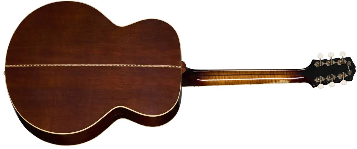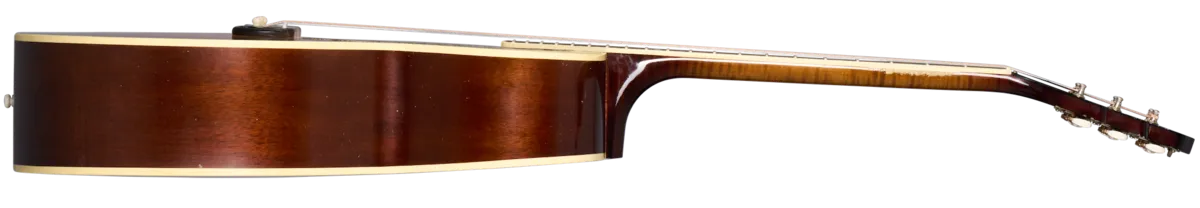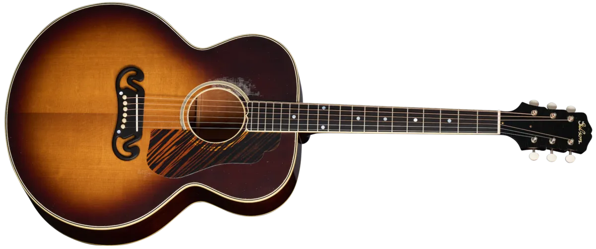 The 1939 SJ-100 is a replica of the rare and very distinctive mahogany-backed Super Jumbo 100 that was built for only a few years (circa 1939-1942). The 1939 SJ-100 Heavy Aged fully replicates the original and exceptionally rare 1939 SJ-100 guitars that are coveted by collectors and vintage Gibson experts around the world. It features a thermally aged red spruce top, mahogany back and sides, and a 2-piece maple neck with a rounded profile and an ebony fretboard. Other notable features include a vintage SJ-100 style firestripe pickguard, the rare, vintage "stair step" headstock design, the Gibson scriptheadstock logo inlaid in mother of pearl, and Waverly tuners with ivoroid knobs. Crafted by the expert luthiers and craftspeople at the Gibson Custom Shop in Bozeman, Montana, it has been artfully aged by the artisans of the Murphy Lab to give it the look and feel of a long-cherished musical companion.