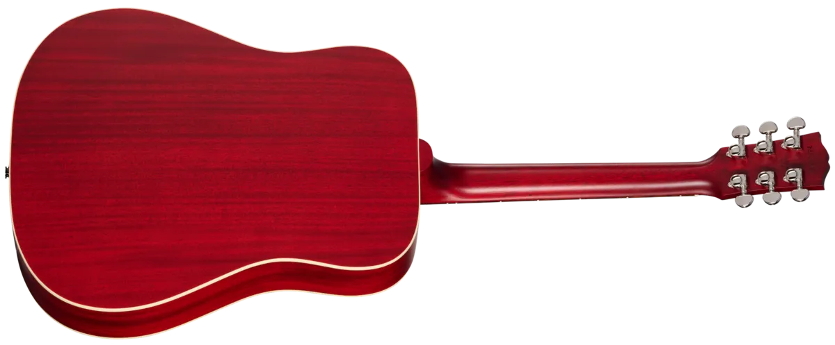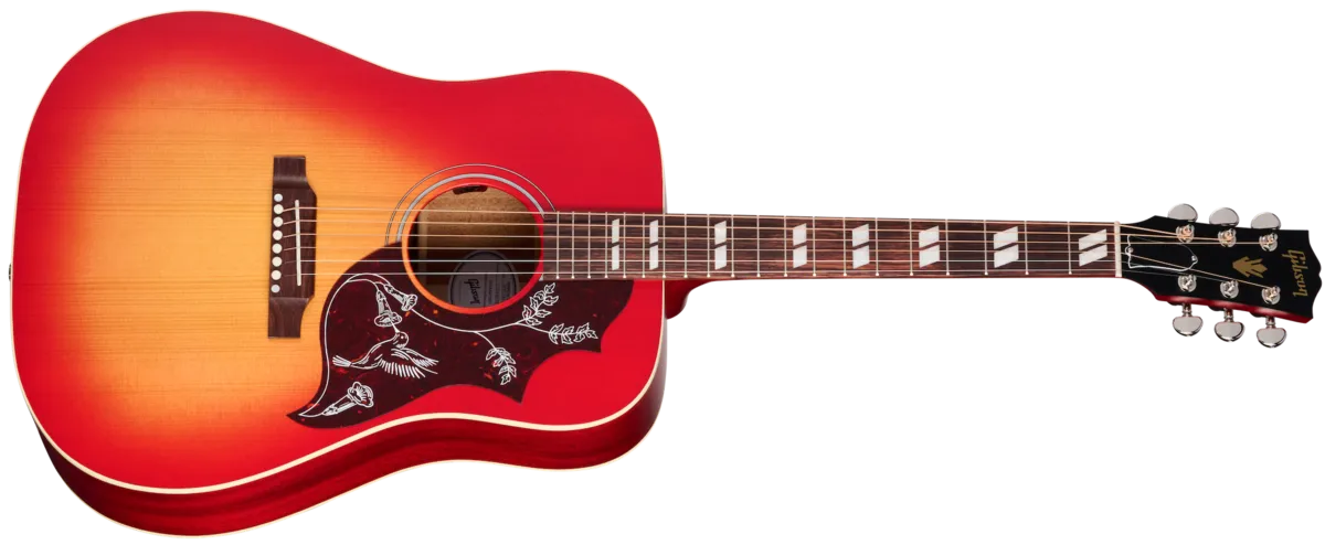First introduced in 1960, the Gibson Hummingbird ™ is one of the most distinctive and well-loved acoustic guitars ever made. Handcrafted with care in Bozeman, Montana, by Gibson's expert acoustic luthiers, the new Gibson Hummingbird Special offers players a USA-built Gibson Hummingbird model at a very attractive price. The Hummingbird Special has a traditional square-shouldered body constructed using genuine solid mahogany for the back and sides and a solid Sitka spruce top that is reinforced with our traditional scalloped X-bracing. This combination of tonewoods delivers a warm, balanced tone with excellent dynamic range that is perfect for any style of music. The "concert depth" body is slightly thinner than the body on a Hummingbird Standard, giving it a leaner and tighter bass response that sits perfectly in the mix and also makes it easier to hold. The utile neck is attached to the body with a compound dovetail neck-to-body joint, and like all Gibson acoustic guitars, it is affixed with hot hide glue. The neck has a comfortable Round profile, and the rosewood fretboard has a 12" radius and features pearloid parallelogram inlays, which is one of the visual hallmarks that makes the Hummingbird easily recognizable. The fretboard is fitted with 20 standard frets. The traditional belly-up rosewood bridge is equipped with a TUSQ® saddle, and the nut and bridge pins are also TUSQ. High-quality Grover® Rotomatic® tuners ensure rock-solid tuning stability. The pickguard features a simplified version of the world-famous Hummingbird pickguard graphics. The Hummingbird Special is finished in satin nitrocellulose lacquer in your choice of Satin Vintage Cherry Sunburst and Satin Wine Red. It comes equipped with an L.R. Baggs™ Element Bronze under-saddle piezo pickup and active preamp with an easily accessible soundhole-mounted volume control, so it's stage and studio-ready from the moment you take it out of the included premium soft shell case.
