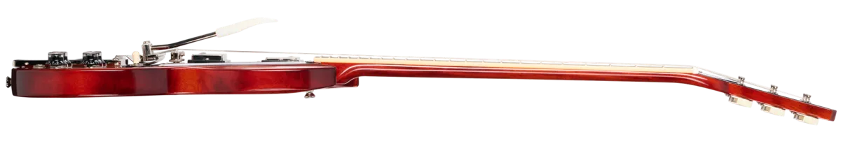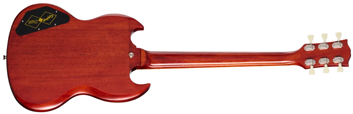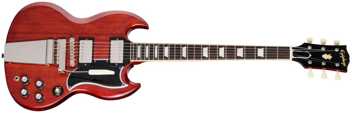 The 1964 SG™ Standard with Maestro ™ Vibrola™ recreates one of the most beloved SG model years of all time-the 1964 SG Standard. While the 1964 SG Standard was famously used by such notable players as George Harrison and Eric Clapton, the model year was a standout for the SG in general. By 1964, the less intuitive Sideways Vibrato had been replaced with the dependable Maestro Vibrola, while the neck profile increased in size somewhat from the ultra-thin neck profiles found on some of the earlier SG models, and the SG's balance, playability, and look seemed to come into its own. 1964 was also the first full year that the SG dispensed with the Les Paul moniker it previously used. Now, Epiphone is proud to release the 1964 SG Standard Reissue with Maestro Vibrola, a stunning recreation of that legendary model. Made in collaboration with Gibson ™ Custom, the Epiphone 1964 SG Standard with Maestro Vibrola is the most authentic recreation of the 1964 SG Standard ever released by Epiphone. All of the classic appointments the 1964 SG Standard model is known and loved for are present here, including a one-piece mahogany neck with a long neck tenon for increased stability and sustain, a comfortable, fast-playing SlimTaper™ profile, and a bound rosewood fretboard. t also features mother-of-pearl trapezoid fretboard inlays, an aged mother-of-pearl Epiphone headstock logo, and an aged mother-of-pearl Gibson crown headstock inlay on the Gibson-style "open book" headstock. The center-seamed, two-piece mahogany body features the comfortable and distinctive bevels that help define a vintage-style SG and make it so comfortable to hold and play. The electronics are equally impressive, with two USA Gibson Custombucker humbucking pickups with Alnico 3 magnets that are hand-wired to CTS® potentiometers, Black Beauty paper-in-oil capacitors, and a Switchcraft® pickup selector toggle switch and output jack. The Vintage Gloss finish is nicely complimented by the nickel hardware, including Epiphone Vintage Deluxe "Double Ring" tuners. A black hardshell case with Inspired by Gibson Custom graphics, gold hardware, and a goldenrod interior is also included.