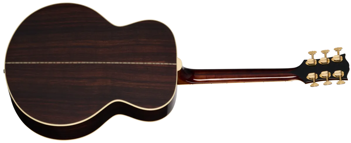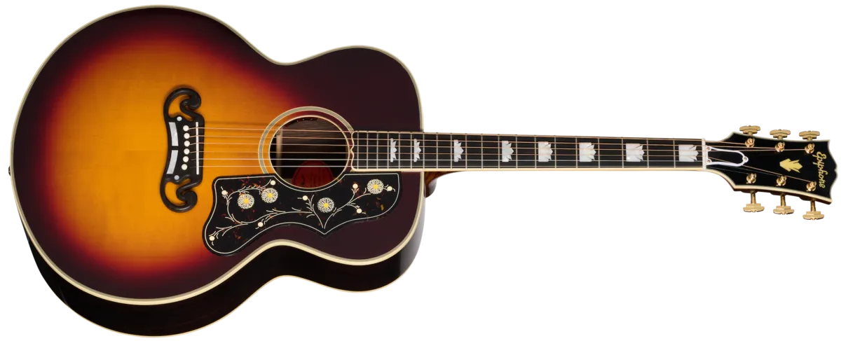 After the Gibson SJ-200 was launched in 1937, it quickly earned the title "the King of the Ny flik at-Tops" due to its superior sound, physical size, outstanding projection, and majestic appearance. The earliest model years of the SJ-200 used rosewood for the back and sides, and this was switched to maple in 1947. Due to the harsh realities of the economy after the Great Depression, there was limited demand for the top-of-the-line SJ-200, and consequently, relatively few were produced. The rare rosewood-bodied pre-war SJ-200 models have become highly prized by today's collectors, which has driven their used prices up significantly on the vintage guitar market. Now, Epiphone has partnered with Gibson Custom to create an Inspired by Gibson Custom recreation of this vintage icon, making it more readily available for today's players to enjoy. The Epiphone Pre-War SJ-200 Rosewood Reissue is replete with vintage-inspired details, including solid rosewood back and sides, a thermally aged solid spruce top with traditional scalloped X-bracing made from quarter-sawn solid spruce, and a two-piece maple neck with a rosewood stringer and Round D profile and is attached to the body with a glued-in dovetail joint. The ebony fretboard is adorned with mother-of-pearl graduated Crown inlays and equipped with 20 standard frets. The SJ-200 style pickguard has vintage-style graphics, and the ebony SJ-200 open two-bar Moustache ™ bridge has mother-of-pearl inlays. The nut, compensated saddle, and bridge pins are all made of bone. The Gibson "open book" headstock features a vintage Epiphone logo and a Gibson Crown inlaid in aged mother-of-pearl and has a stinger and an Inspired by Gibson Custom Double Diamond logo etched on the rear. In a nod to the needs of modern musicians, it comes with an under-saddle L.R. Baggs ™ Element Bronze VTC piezo pickup and active preamp with soundhole-mounted volume and tone controls pre-installed, so it is stage and studio ready, straight out of the included Red Line-inspired hardshell case with Inspired by Gibson Custom graphics.