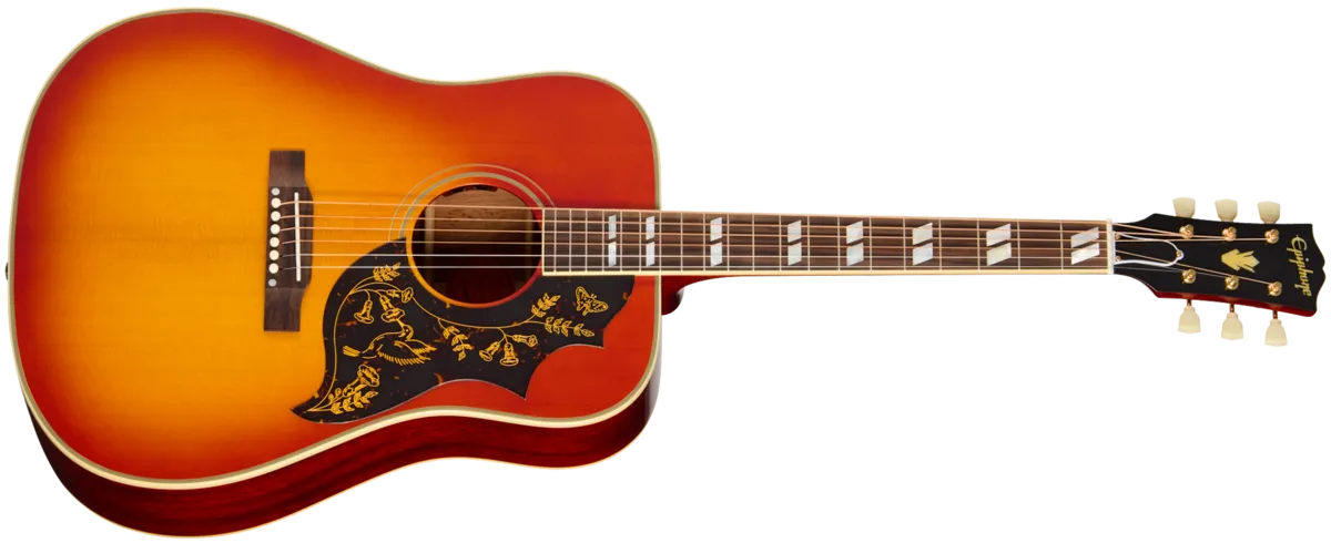 The Gibson Hummingbird™ was first introduced in 1960 and was the first square shoulder acoustic guitar model in the Gibson catalog. It arrived at the dawn of a new era in music and has been seen in the hands of many players since then, including Keith Richards and Brian Jones of the Rolling Stones, Eric Church, J Mascis, Joe Bonamassa, Gillian Welch, Thom Yorke and Jonny Greenwood of Radiohead, Steve Wariner, Dan Auerbach, and many more. Much of the Hummingbird's appeal lies in its versatility. No matter how you attack this flat-top, whether softly fingerpicking, strumming it hard, or ripping single-note solos, it pumps out beautiful tones, making it an ideal choice, no matter what musical genres you're into. Now, Epiphone, in collaboration with Gibson Custom, is proud to introduce the 1960 Hummingbird Reissue, an Inspired by Gibson Custom recreation of those iconic first-year Hummingbirds. This gorgeous acoustic guitar has a thermally aged solid spruce top that is reinforced with traditional scalloped X-bracing made from quarter-sawn, solid spruce. The back and sides of the 1960 Hummingbird Reissue are made from solid mahogany. It delivers a warm, rich tone overall that works extraordinarily well in a wide range of musical styles. The one-piece, thermally-aged, 24.75" scale mahogany neck has a Rounded profile that is capped with a bound rosewood fretboard that is outfitted with 20 standard frets and adorned with mother-of-pearl split parallelogram inlays. The 1960 Hummingbird features all of the ornamentation that makes the vintage originals instantly recognizable. The body features multi-ply top and back binding. The belly up rosewood bridge plate is equipped with a compensated bone saddle, and the nut and bridge pins are also bone. The pickguard features the legendary Hummingbird shape and engraved artwork design. On the headstock, gold-plated Epiphone Deluxe tuners with green Keystone buttons help ensure solid tuning stability so you can spend more time playing and less time looking at an electronic tuner. The headstock features a two-ply black and white truss rod cover, and the Epiphone logo and Gibson Crown are inlaid in aged mother-of-pearl. The headstock features a Gibson-style "open book" profile with the Inspired by Gibson Custom double diamond logo etched on the rear. To ensure it meets the live performance and recording needs of today's players, the 1960 Hummingbird Reissue comes equipped with a built-in L.R. Baggs™ Element Bronze VTC preamp and under-saddle piezo pickup system, sO it's stage and studio-ready whenever you are. A Red Line-inspired hardshell case, which features the Inspired by Gibson Custom logo on the exterior, is also included to keep this beautiful acoustic guitar safe when you're traveling to your next performance.