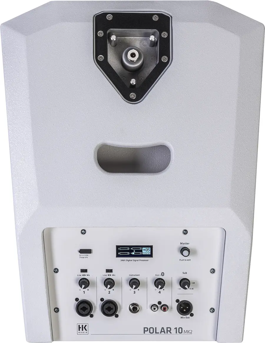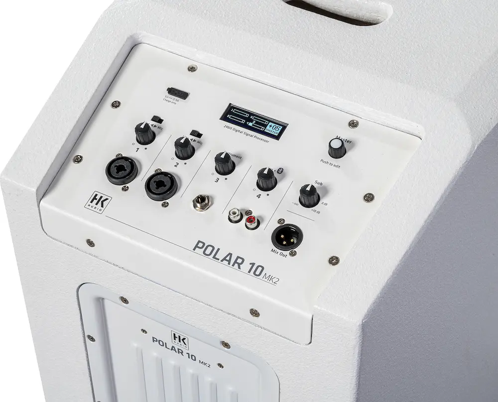 The POLARMK2 ColumnSix efficient, lightweight 3" neodymium midrange drivers in a low-resonance aluminium profile ensure a particularly high-resolution, unadulterated reproduction of instruments and the human voice. The combination of a 1" precision high-frequency driver with a constant directivity horn delivers 120° dispersion to provide optimal sound coverage of the audience. A completely newly developed connector creates a secure and smooth connection between the components. Without spacers, POLAR MK2 is also perfectly suited for applications where sound is to be projected to a seated audience, for example. The column elements are delivered in a padded transport bag to save space, which also offers even more security and protection.The POLARMK2 SubwooferWhen it comes to deep bass, nothing can replace volume. We use applied physics instead of extreme pre-filtering. The newly designed, voluminous and torsion-resistant wooden cabinet effectively suppresses resonance. The high-performance long-throw woofers guarantee clean, dry bass. Cleverly positioned recessed grips on the top and base make transport and handling easier. The padded protective cover for the subwoofer is included, and an optional wheel board is also available.The integrated MixerPOLAR offers a 4-channel mixer including master volume control, Bluetooth 5.0 and TWS audio streaming: two channels for microphones and line signals (e.g. mixers, keyboards), a high-impedance instrument channel (guitar) and an AUX channel for DJ equipment or MP3 players, which simultaneously controls Bluetooth audio. The microphone inputs feature switchable phantom power for operating high-resolution condenser microphones. A USB-C charging socket is also integrated for maintaining the charge of smartphones, tablets and battery-powered wireless microphone receivers without the need for an additional charger. With Bluetooth TWS (True Wireless Stereo), two POLAR MK2 systems can be connected wirelessly to play a stereo stream from a tablet or smartphone.