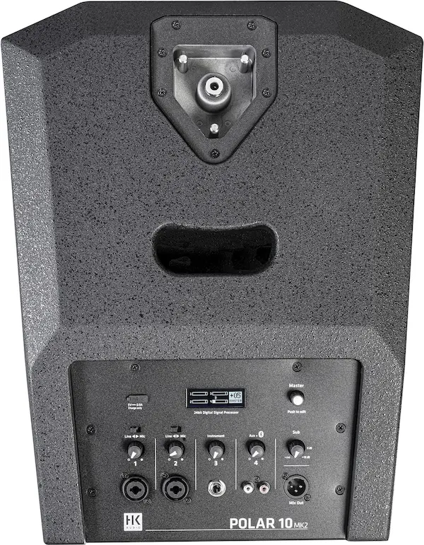 POLAR offers a 4-channel mixer including master volume control, Bluetooth 5.0 and TWS audio streaming: two channels for microphones and line signals (e.g. mixers, keyboards), a high-impedance instrument channel (guitar) and an AUX channel for DJ equipment or MP3 players, which simultaneously controls Bluetooth audio. The microphone inputs feature switchable phantom power for operating high-resolution condenser microphones. A USB-C charging socket is also integrated for maintaining the charge of smartphones, tablets and battery-powered wireless microphone receivers without the need for an additional charger. With Bluetooth TWS (True Wireless Stereo), two POLAR MK2 systems can be connected wirelessly to play a stereo stream from a tablet or smartphone.