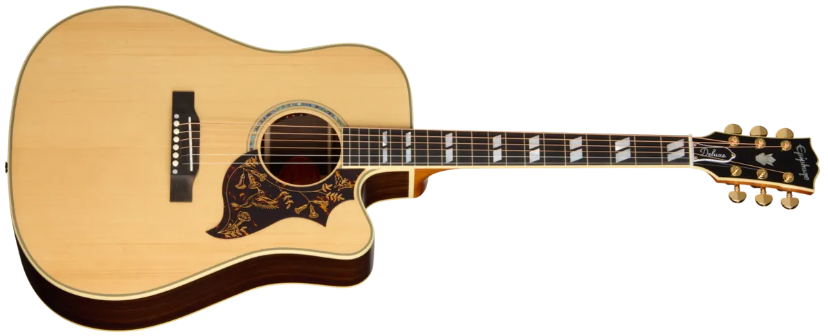 Deluxe EC, Natural The unmistakable Hummingbird™, in a new Deluxe cutaway version, has joined the Epiphone Inspired by Gibson Custom lineup. These beautiful acoustic guitars have been designed and configured by Epiphone in partnership with the Gibson Custom acoustic guitar team in Bozeman, Montana. The Hummingbird Deluxe EC has been upgraded and modernized with beautiful, solid rosewood used for the back and sides, giving this guitar the full and rich sound of the traditional Hummingbird, along with the added tonal nuances of rosewood, resulting in a deeper bass and even more sparkling overtones in the highs. The Hummingbird Deluxe EC's cutaway body provides easier access to the upper frets, making this an excellent choice for lead guitarists and others who want to explore the entire range of the fretboard. The rosewood back and sides are paired with a thermally aged solid spruce top, resulting in a pre-aged tone that is louder and more resonant than that of a non-thermally aged top. It's like getting the benefits of many years of wood aging and seasoning in a brand-new guitar. The top is reinforced with traditional scalloped X-bracing, which is made from quartersawn, solid spruce. The Hummingbird Deluxe EC also features a one-piece mahogany neck with a Rounded C profile. The neck is glued in using a dovetail joint. It is topped with an ebony fretboard that is equipped with 20 standard frets and adorned with classy-looking mother-of-pearl split parallelogram inlays. The Hummingbird Deluxe EC's body has 6-ply binding on the top and 4-ply binding on the back. There is also single-ply binding on the fretboard and headstock, which further adds to the guitar's premium aesthetic, along with gold hardware, including smooth and precise Grover® Rotomatic® tuners that are installed on the Gibson "open book" headstock and the three-band rosette' abalone-inlaid center band. The headstock also has the Epiphone logo and Gibson Crown inlaid in mother-of-pearl. The pickguard is made using an acrylic-celluloid sandwich and features the instantly identifiable Hummingbird graphics etched in gold. The nut, compensated saddle, and bridge pins are all made from bone, while the reverse belly ebony bridge is from Gibson. The Hummingbird Deluxe EC comes with an L.R. Baggs VTC Bronze pickup and preamp with soundhole-mounted volume and tone controls pre-installed, so it's ready for the stage or studio whenever you are. The Hummingbird Deluxe EC also comes with Epiphone's new Protector Ultralite case. This hybrid case design was inspired by the original Red Line cases that accompanied historic Gibson acoustic guitars. It combines convenience and protection, blending the lightweight portability of a gig bag with the robust security of a hardshell case. It features a soft plush lining to cushion the guitar, along with roomy interior compartments for spare strings, picks, capos, and other essential accessories. It also features a reinforced nylon web handle and padded shoulder straps for added comfort when traveling. A battery is not included. To power your pickup, you will need a 9-volt battery.
