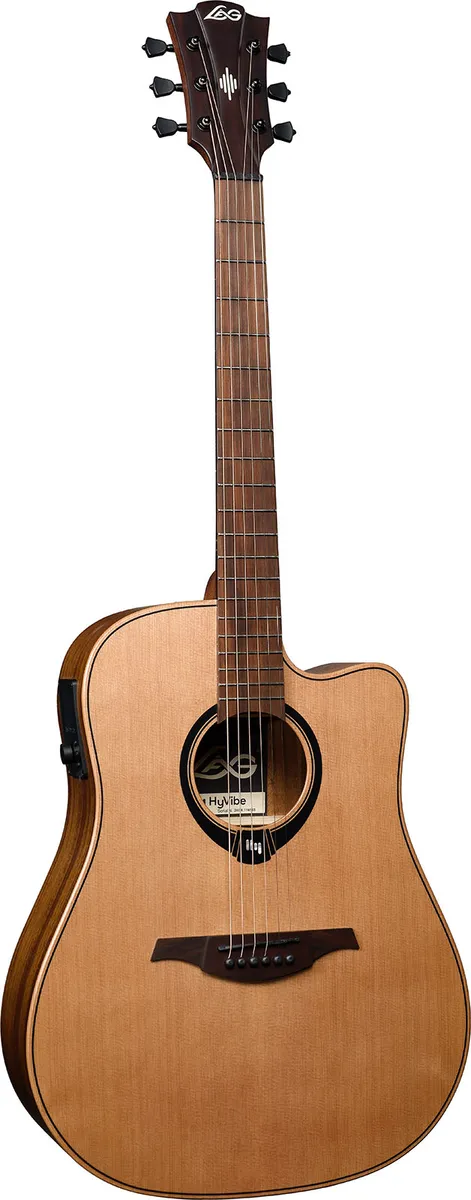 The HV10DCE combines the iconic power of the dreadnought shape with the revolutionary HyVibe H2 preamp. Its solid red cedar top and Khaya mahogany back and sides deliver a warm, resonant tone