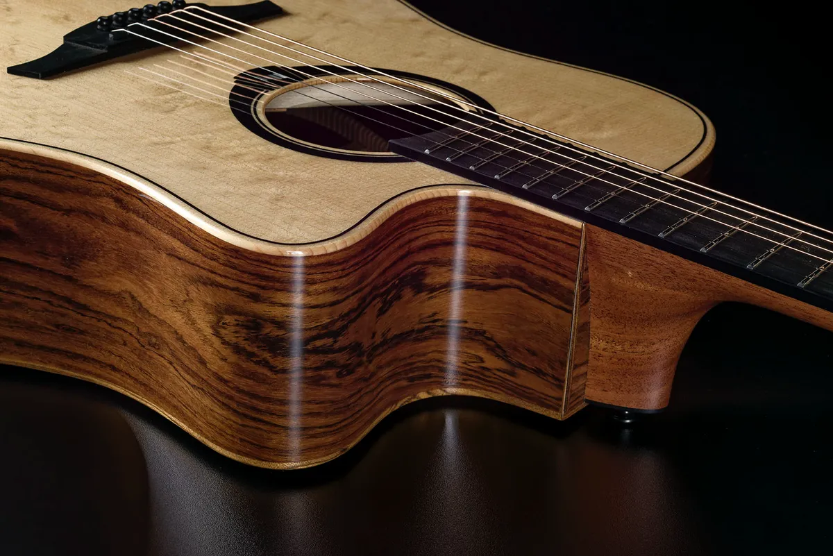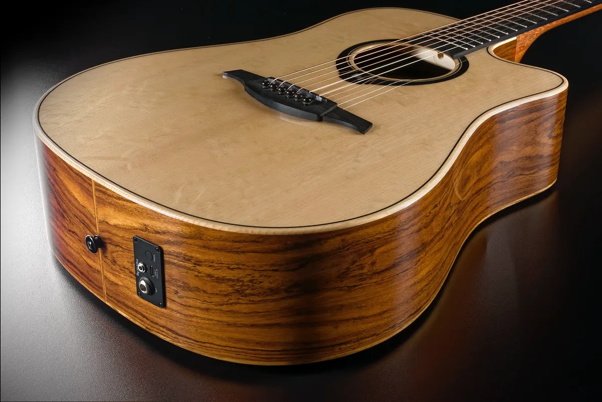 tones, while the figured Bocote (Mexican Rosewood) back and sides add depth and a striking visual appeal. The cutaway design ensures effortless access to the upper frets, making it ideal for dynamic