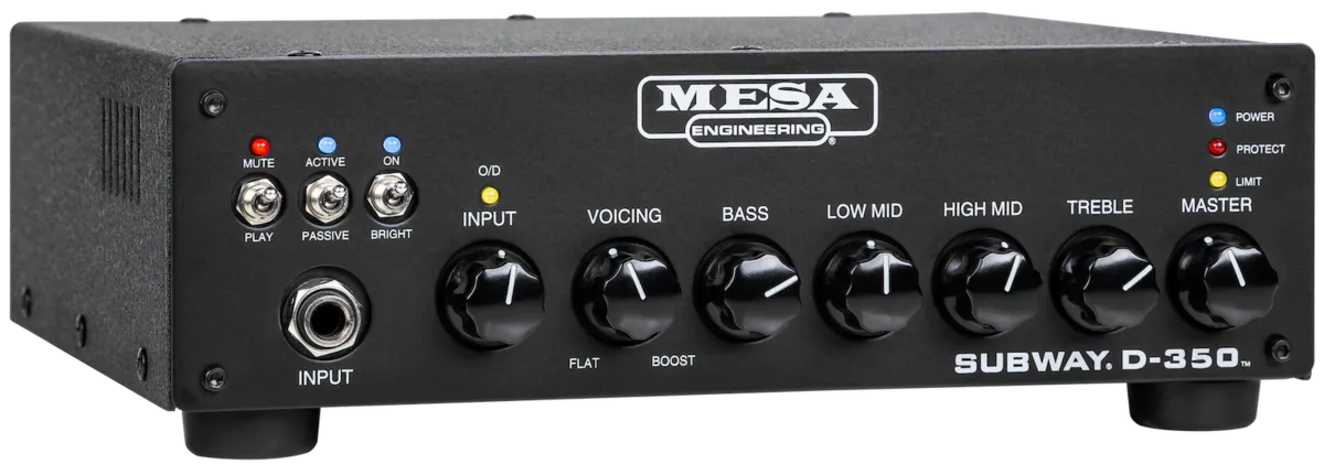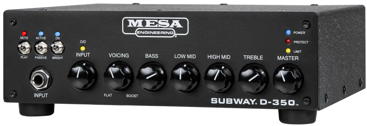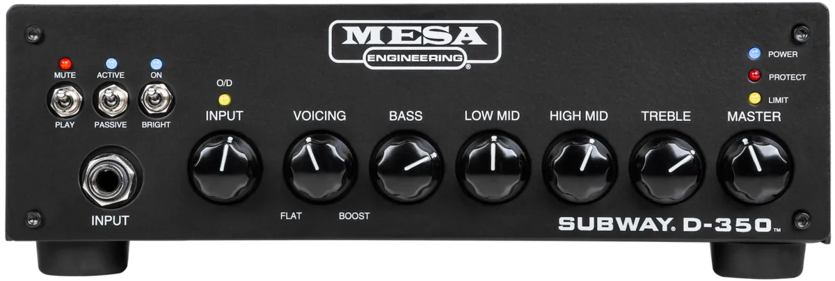 The MESA Subway D-350 easily adapts for use with active or passive basses with the flip of the Active/Passive switch, while the Input Mute switch lets you use inline tuners silently. The Bright switch adds bite and sparkle to the tone and opens up the top end a bit more, and all the switches have LED status indicators Separate Gain and Master Volume controls allow you to dial up a wide range of tones from shimmering clean to mild overdrive and everything in between, while the built-in fixed high-pass filter (HPF) blocks unwanted, non-musical, headroom-robbing sub-sonic frequencies.