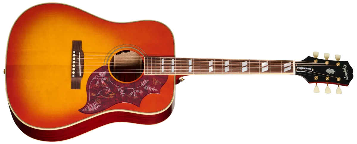The Hummingbird™ is one of the most instantly recognizable and remarkable acoustic guitars ever built. First released by Gibson in 1960, it was their first square shoulder acoustic dreadnought model. The stylish and versatile Hummingbird was quickly and enthusiastically embraced by numerous musicians across a wide range of genres. Now, Epiphone is proud to introduce a newly updated Hummingbird Standard as part of the Inspired by Gibson Collection, which delivers high-quality versions of classic Gibson models at accessible prices.The Hummingbird Standard is crafted using all solid tonewoods, so the tone will continue to improve as the guitar ages. The back and sides of the body are made of solid mahogany, while the top is crafted from solid spruce, for the classic tonewood recipe that has made the sound of the Hummingbird iconic. The neck is also made from one piece of solid mahogany, and is now equipped with a genuine rosewood fretboard with 20 standard frets and classy-looking mother-of-pearl split parallelogram inlays, one of the visual hallmarks of the classic Hummingbird design. The neck has a comfortable Rounded C profile and is glued to the body and attached with a tapered dovetail joint. The 60s Kalamazoo headstock is adorned with the Epiphone logo and Gibson crown inlaid in mother-of-pearl and equipped with a bone nut and high-quality Epiphone Deluxe tuners with a gold finish and Keystone buttons, ensuring solid, stable tuning. Other classic Hummingbird features include an epoxy-style tortoise Hummingbird pickguard with iconic graphics, a reverse belly rosewood bridge with a bone saddle and ivory plastic bridge pins, and a beautiful Cherry sunburst finish.The Hummingbird Standard comes with Fishman ™ electronics, including an S-Core under-saddle pickup and Fishman Presys VT preamp with soundhole-mounted volume and tone controls that are fast and easy to access for the player while remaining nearly invisible to the audience. It comes packaged in an Epiphone premium gig bag to help keep it safe, and for easy grab-and-go transport to wherever your music takes you.