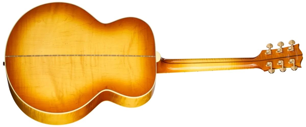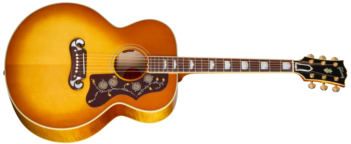 The legacy of Gibson's "King of the Flat-Tops" lives on in the SJ-200 60s Original. From its inaugural appearance in 1937, the Gibson SJ-200 ™ set an unmatched standard. The SJ-200 60s Original continues the legacy of one of the world's most famous and popular acoustic guitars. The SJ-200 60s Original replicates the SJ-200 as it appeared in the 1960s, a time when the model could be found in the hands of such noteworthy players as Pete Townshend, Bob Dylan, George Harrison, and Jimmy Page, among others. This is the SJ-200 as used on some of the most legendary songs and albums ever recorded.The SJ-200 60s Original features a AAA figured maple body, with a checkerboard marquetry strip down the center of the back, a solid AAA Sitka spruce top, and is presented in distinctive 60s-style nitrocellulose lacquer finishes. The two-piece maple neck has a walnut stringer and a comfortable Round profile, and a narrower 1.687" nut width as found on SJ-200 guitars from that era, which makes first-position chords easier to play. The rosewood fretboard is dressed up with classic mother-of-pearl graduated crown inlays, one of the visual hallmarks of the SJ-200, and is equipped with 20 standard frets. The no-border SJ-200 pickguard features the instantly-identifiable and iconic graphics, and the solid rosewood Moustache M bridge is also adorned with mother-of-pearl hourglass and teardrop inlays. In a nod to the preferences of many modern players, instead of a Tune-O-Matic ™, the SJ-200 60s Original features a bone saddle. The SJ-200 60s Original comes equipped with gold Grover® Rotomatic® tuners for solid tuning stability, a bone nut, and TUSQ® bridge pins, and it is stage and studio-ready with an internal L.R. Baggs ™ VTC under-saddle pickup and preamp system with volume and tone controls discretely mounted in the soundhole. A Gibson hardshell case is also included to keep this iconic guitar safe during travel.