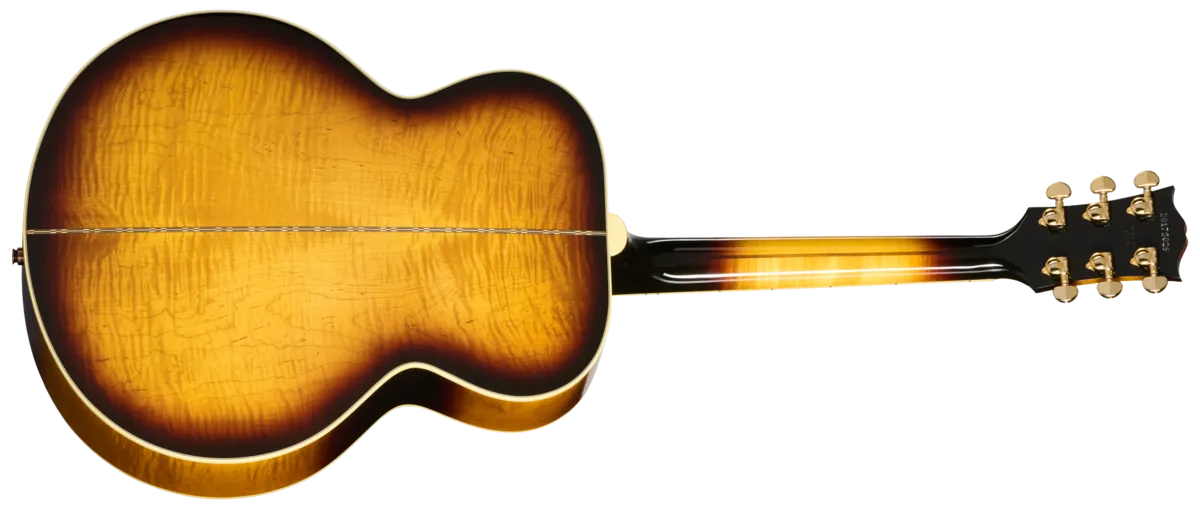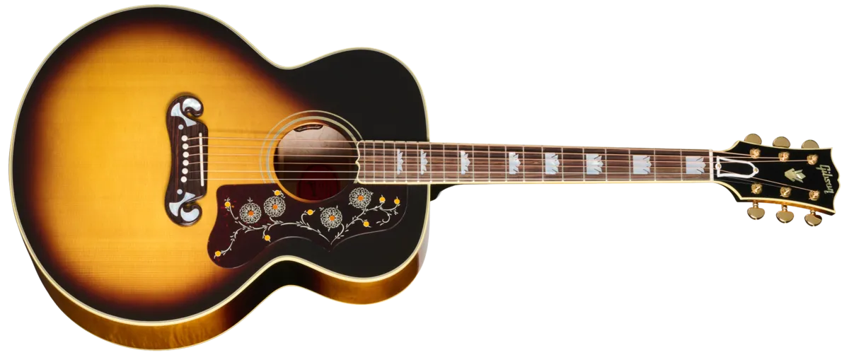 The legacy of Gibson's "King of the Flat-Tops" lives on in the SJ-200 60s Original. From its inaugural appearance in 1937, the Gibson SJ-200 ™ set an unmatched standard. The SJ-200 60s Original continues the legacy of one of the world's most famous and popular acoustic guitars. The SJ-200 60s Original replicates the SJ-200 as it appeared in the 1960s, a time when the model could be found in the hands of such noteworthy players as Pete Townshend, Bob Dylan, George Harrison, and Jimmy Page, among others. This is the SJ-200 as used on some of the most legendary songs and albums ever recorded.The SJ-200 60s Original features a AAA figured maple body, with a checkerboard marquetry strip down the center of the back, a solid AAA Sitka spruce top, and is presented in distinctive 60s-style nitrocellulose lacquer finishes. The two-piece maple neck has a walnut stringer and a comfortable Round profile, and a narrower 1.687" nut width as found on SJ-200 guitars from that era, which makes first-position chords easier to play. The rosewood fretboard is dressed up with classic mother-of-pearl graduated crown inlays, one of the visual hallmarks of the SJ-200, and is equipped with 20 standard frets. The no-border SJ-200 pickguard features the instantly-identifiable and iconic graphics, and the solid rosewood Moustache M bridge is also adorned with mother-of-pearl hourglass and teardrop inlays. In a nod to the preferences of many modern players, instead of a Tune-O-Matic™, the SJ-200 60s Original features a bone saddle. The SJ-200 60s Original comes equipped with gold Grover® Rotomatic® tuners for solid tuning stability, a bone nut, and TUSQ® bridge pins, and it is stage and studio-ready with an internal L.R. Baggs™ VTC under-saddle pickup and preamp system with volume and tone controls discretely mounted in the soundhole. A Gibson hardshell case is also included to keep this iconic guitar safe during travel.