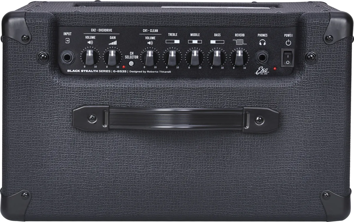 A compact format!The G-BS35 was developed by Eko, in partnership with technician Roberto Tittarelli, to offer guitarists a compact transistor combo for practicing electric guitar. This combo delivers 35W through a 12-inch speaker and allows you to explore a variety of sounds and musical styles thanks to its two channels (clean and drive) selectable via a switch, for clear or more saturated sounds. The reverb effect is perfect for adding depth to your sound.Simple but powerful!The G-BS35 features a simple but powerful interface: a volume control for the clean channel, complemented by a classic three-band EQ, and gain and volume controls for the overdrive channel. A switch allows you to select the desired channel, but this can also be done via the footswitch input (not included). In addition to the guitar input, this small amplifier includes an auxiliary input for playing along with your favorite songs, as well as a headphone output for discreet practice when needed. Finally, an effects loop also allows you to insert your guitar effects pedals to enhance your sound.Compact and portable at 22.5 Ibs, the G-BS35 is a versatile guitar combo for beginner or experienced guitarists looking for an affordable amp for home use, small rehearsals, or gigs.