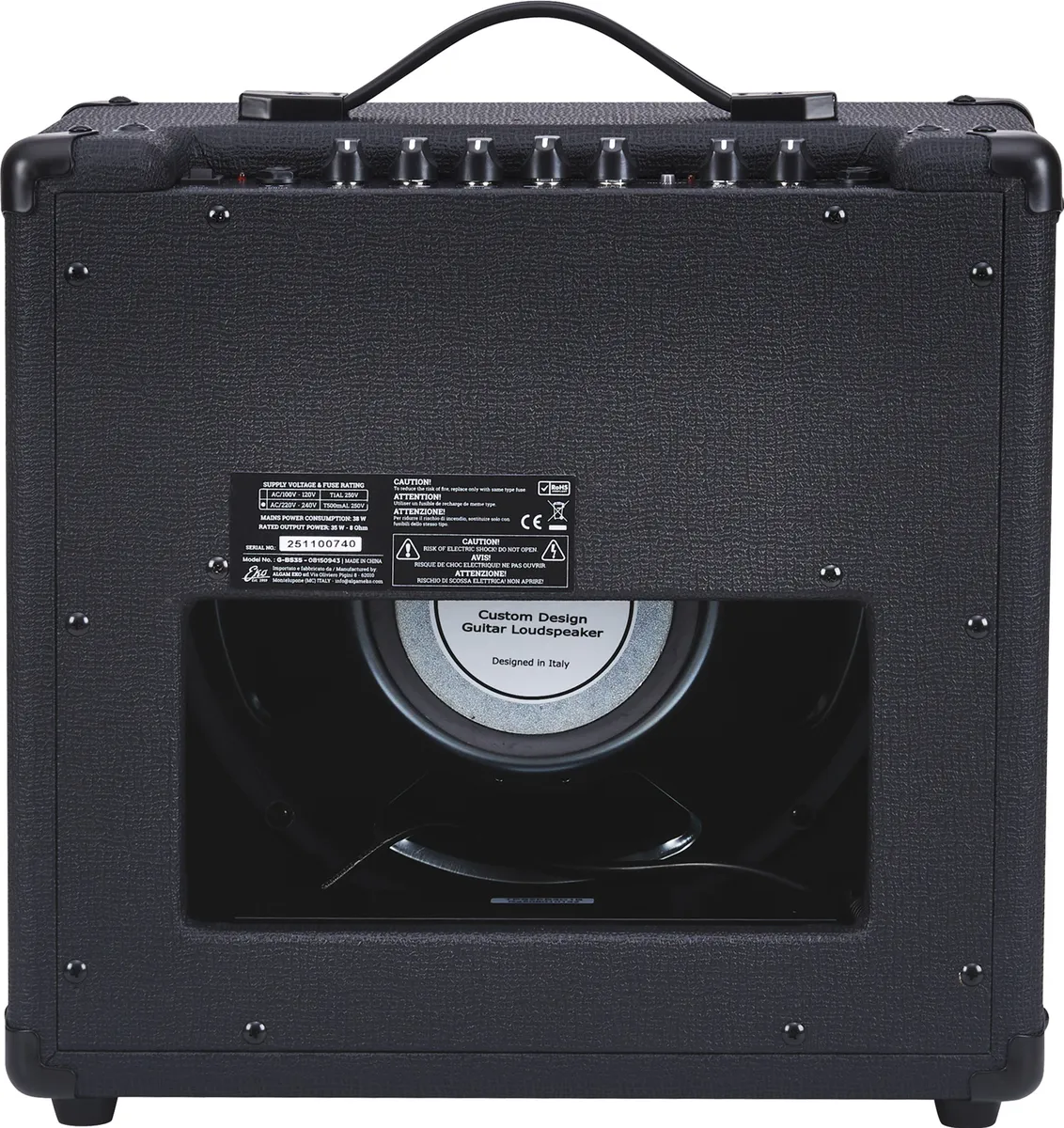 - Category: Guitar combo- Color: Black- Dimensions (mm) : 390 x 375 x 240 - EQ: 3 channels- Effects loop : Yes- Footswitch input : Yes- Headphone output : Jack 6.35- Input : aux jack, instrument jack - Number of channels : 2- Pedalboard included : No- Power output: 35 W- Power supply: AC Adapter- Reverb : Yes- Speaker diameter: 12"- Technology : Solid state- Weight: 10.20 kg