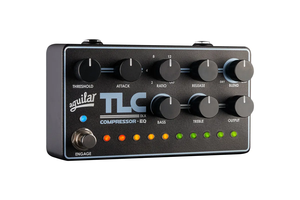 The TLC DLX Compressor EQ is Aguilar's most full-featured bass compressor to date, combining professional dynamic control with musical EQ in a compact, pedalboard-friendly format. Built on the foundation of the original TLC Compressor, the DLX expands the control set to give bassists complete command over dynamics, feel, and consistency—while adding broad, musical tone shaping inspired by Aguilar's classic DB 925 circuit. Designed for both stage and studio use, the TLC DLX delivers transparent compression, intuitive visual monitoring, and tone enhancement that feels natural under the fingers and sits effortlessly in the mix. • Studio-style compression with full control • Integrated Bass & Treble EQ for musical tone shaping • LED gain-reduction metering for instant visual feedback The TLC DLX is built for bassists who want more than simple "on/off" compression. It follows a familiar studio workflow-first control dynamics, then enhance tone—bringing the feel and flexibility of a channel strip to the pedalboard. Whether used for subtle leveling, added punch, or firm peak control, the TLC DLX offers precise control while preserving the natural character of your instrument.