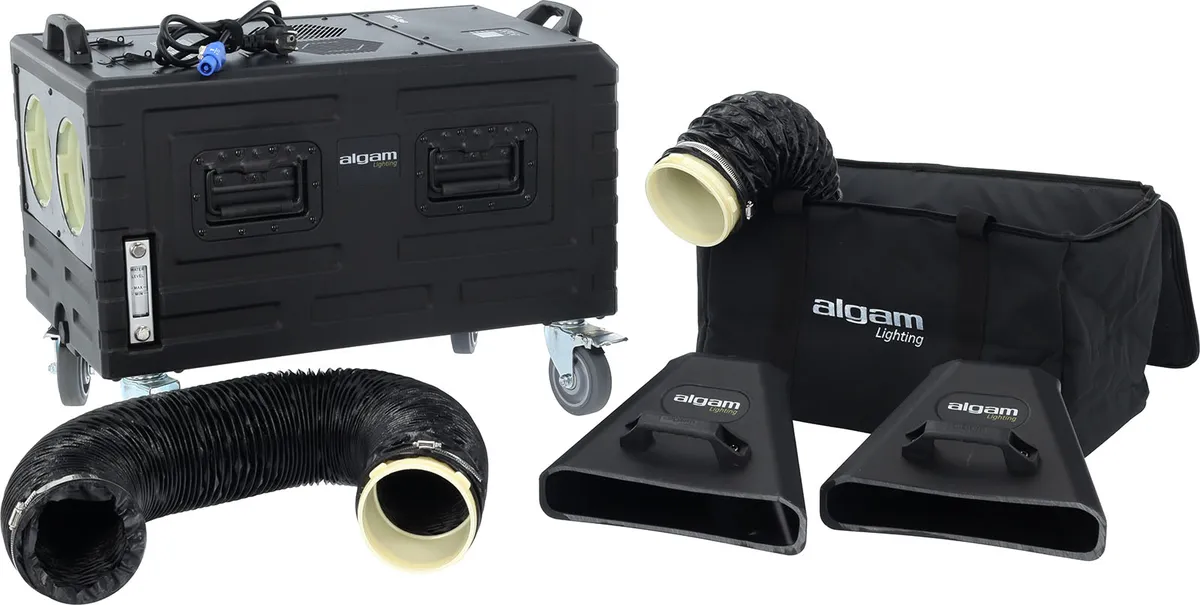- Supplied with: PowerCon power cable, wireless remote control, accessory storage bag, 2 output nozzles, and 2 hoses with hose clamps