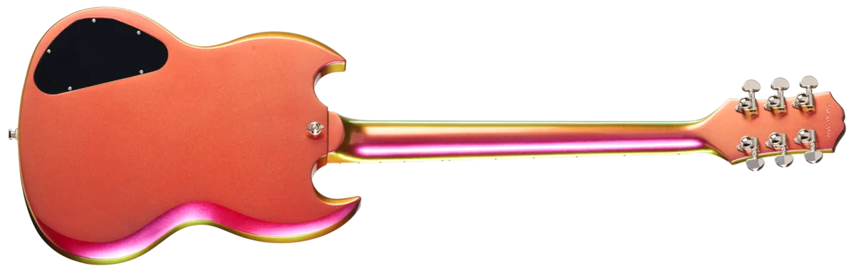 The new Futura Series guitars from Epiphone are designed for today's guitarists who want an instrument that delivers professional performance and forward-thinking features. These Inspired by Gibson models deliver tone and style that's perfect for gigging, recording, or content creation in the modern era. With bold, color-shifting finishes, all-new pickups, and versatile electronic features like coil splitting and phase switching, they have the look and sound that today's players need to stand out from the crowd and make their own statement, both sonically and visually. Other high-performance features, including stainless steel frets, compound-radius fretboards, and ultra-comfortable neck profiles, make the Futura Series guitars truly innovative and a must-have addition for any guitar collection.The Gibson SG™ has remained one of Gibson's most iconic solidbody models since its debut in 1961. Originally introduced as a redesigned Les Paul™ ', it quickly earned its own identity as the SG-short for Solid Guitar. Epiphone proudly presents the Futura SG Custom, a contemporary interpretation of this legendary design that still exudes sleek, aggressive style more than six decades later. Its double-cutaway mahogany body retains the classic SG contours for both visual appeal and playing comfort. Hardware includes a LockTone T™ Tune-O-Matic ™ bridge, LockTone Stop Bar tailpiece for superior sustain and tuning stability, and Posi-Lok'™ strap buttons for secure performance. The glued-in mahogany neck sports a fast-playing Modern C profile, topped with a bound ebony fingerboard featuring 22 stainless steel medium jumbo frets, Super 400-style pearloid split-block inlays, and a smooth 10"-14" compound radius for effortless chording and bends. The bound Kalamazoo headstock adds elegance with locking Grover® Rotomatic® tuners, a Graph Tech® nut, and mother-of-pearl inlays for the Epiphone logo and Custom split diamond motif.Driving the Futura SG Custom are Epiphone's new ProBucker™ Ignite humbuckers T™ delivering powerful tones with clarity and definition. Push/pull controls unlock coil-splitting and phase options for expanded sonic versatility. Available in three stunning Chromashift finishes-Dragonfly Shift, Nitro Shift, and Midnight Ember Shift-this guitar is designed to turn heads on stage or on camera. Whether you want a modern aesthetic, a wide tonal palette, or an instrument that inspires creativity, the Futura SG Custom delivers. Each one ships with a premium gig bag, ready to accompany you wherever inspiration strikes.