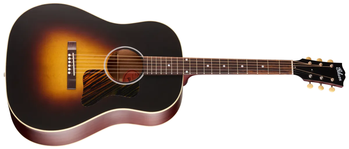 Since the 1930s, Gibson's full-size, round-shoulder acoustics have shaped the sound of American music, becoming the most frequently recorded acoustic guitars thanks to their rich warmth, expressive character, and remarkable balance across every note. Among these celebrated instruments, the J-45 M has earned iconic status. First released in 1942, the model quickly became known as the "Workhorse" for its straightforward design, understated good looks, and its long history on stages and in studios around the globe. It remains Gibson's best-selling acoustic of all time.Gibson now proudly unveils a fresh take on this legendary guitar: the J-45 Century 12-Fret. While it embodies the familiar features that players associate with the J-45, this version shifts to a 12-fret neck-to-body joint in place of the standard 14-fret configuration. This change shortens the overall neck length and moves the bridge plate deeper into the body, positioning it closer to the widest part of the top. That placement allows the soundboard to move more efficiently, creating a comfortably played instrument with a warm, punchy, resonant voice—one that responds especially well to fingerstyle technique and lighter picking dynamics.Although Gibson has built 12-fret J-45 variations before, they've traditionally appeared only as artist collaborations or in limited Gibson Custom runs, making them sought after and relatively uncommon. With the introduction of the J-45 Century 12-Fret, this distinctive feel and tone are now available to every player. As part of the new Century Collection, celebrating a century of Gibson flat-top craftsmanship, it pairs a mahogany body with a Sitka spruce top, accented by single-ply cream binding tracing the top and back.The mahogany neck features the fast, familiar Slim Taper™ 12-Fret profile and is joined to the body at the 12th fret with a compound dovetail joint secured with hot hide glue, consistent with Gibson's traditional acoustic builds. A rosewood fretboard carries 19 frets and simple mother-of-pearl dot inlays.Up top, the headstock is fitted with open-back Golden Age strap tuners with cream buttons and dressed with an early-1900s-style Gibson script logo decal. A sloped rectangle closed-slot rosewood bridge- echoing those found on the earliest J-45 models-adds another vintage-inspired touch. The guitar features a bone nut and saddle, TUSQ® bridge pins, a classic Gibson L-00-style pickguard, and a hand-sprayed satin nitrocellulose lacquer finish.Each J-45 Century 12-Fret ships in a premium Century Collection tweed hardshell case and is offered in both right and left-handed versions. Pick one up today and discover the distinctive, resonant voice of a 12-fret Gibson flat-top.