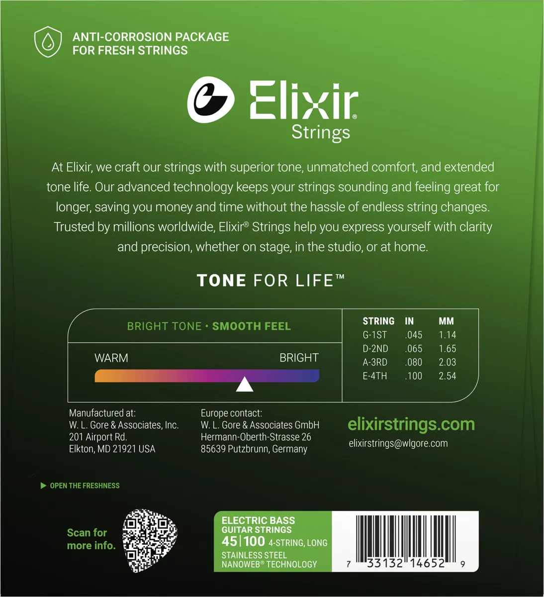 Elixir® Stainless Steel Bass Strings with a NANOWEB® Coating provide a bright stainless tone with deep lows.