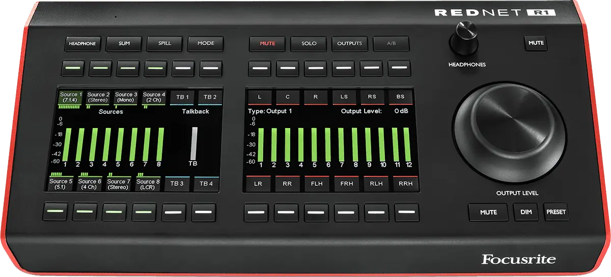RedNet R1 is a desktop remote controller that supercharges any Red range interface, by enabling audio professionals to interact with their audio like never before. It can control a range of different monitor output setups, ranging from mono through to 7.1.4 surround, including Dolby Atmos® and other immersive audio workflows. Alternatively, completely custom setups of up to 12 outputs can be configured for bespoke speaker configurations.