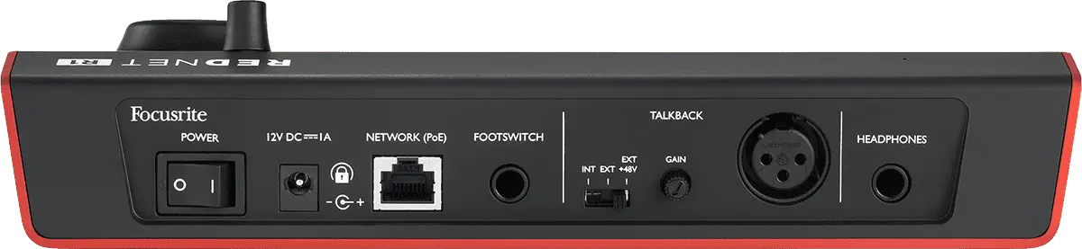 The unit is configured using RedNet Control, the software manager designed primarily for ease of use in quickly setting up both simple and complex monitoring and routing configurations. Other features of the RedNet R1 include a quarter-inch jack socket, which accepts a footswitch for talkback management, LFE muting and more. It can be powered via Ethernet to reduce cabling complexity (using the PoE standard), or by the supplied DC power supply.