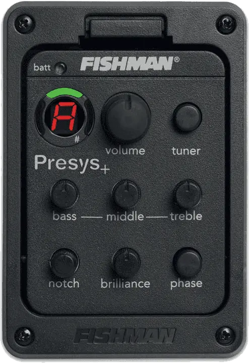 The Presys+ Onboard Preamp System is designed to offer maximum control, performance and quality in a small, unobtrusive format. The compact sophisticated Presys+ system features Volume, Bass, Mid and Treble controls, a Phase switch, and a built-in tuner with LED display. The Presys+ preamp also includes a pre-wired Fishman Sonicore pickup for solder-free, plug and play installation, as well as a low battery indicator, low profile control knobs, and a unique pivot design for easy access to the battery compartment.