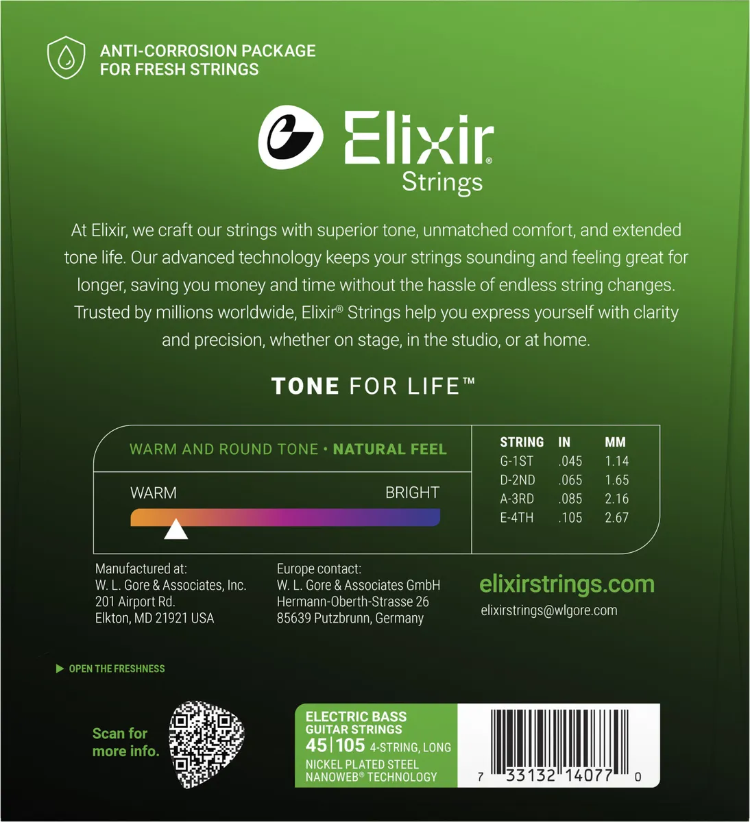 Elixir® Nickel Plated Steel Bass Strings with a NANOWEB® Coating deliver a rich, rounded tone with greater clarity and heavier mid-range presence.
