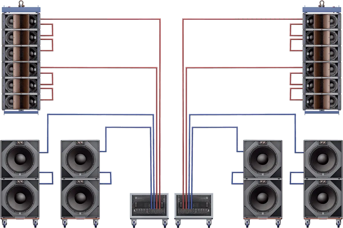 Complete Cosmo Line Array setup with 12x C8, 8x Csub 118 and accessories.