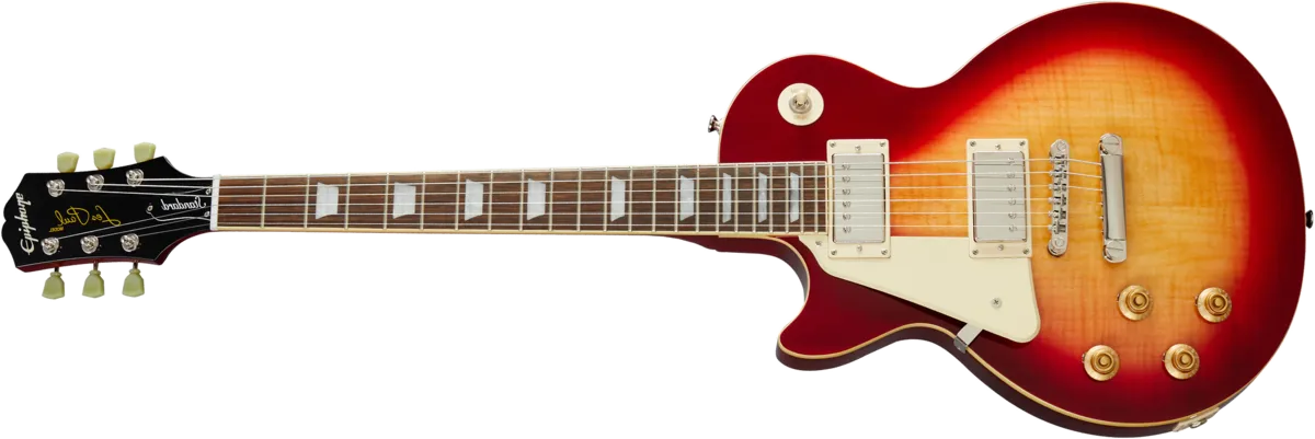 The Les Paul Standard 50s models are part of Epiphone’s new Inspired by Gibson Collection and recreate the sound of 1950s era Les Pauls. Featuring a classic Mahogany Body with a Maple cap and Mahogany neck with long neck tenon. Powered by ProBucker™ humbuckers with 50s style wiring and CTS electronics. Available in Metallic Gold, Vintage Sunburst, and Heritage Cherry Sunburst. Epiphone’s long friendship with Mr. Les Paul began in 1940 when Les built one of the world’s first solid body electric guitars while working nights at the original Epiphone factory in Manhattan. Les’ first solidbody guitar, nicknamed “the Log”, would go on to inspire the Les Paul Standard, what many consider the greatest electric guitar ever made.