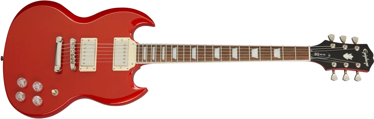 The Epiphone SG Muse from the new Inspired by Gibson Collection features a classic SG profile with a Mahogany body powered by high output Alnico Classic PRO™ humbuckers with coil-splitting and phase controls plus a treble bleed circuit to maintain clarity at lower volumes. Available in all new metallic finishes including Radio Blue Metallic, Wanderlust Green Metallic, Purple Passion Metallic, Smoked Almond Metallic, Pearl White Metallic, Jet Black Metallic, and Scarlet Red Metallic.