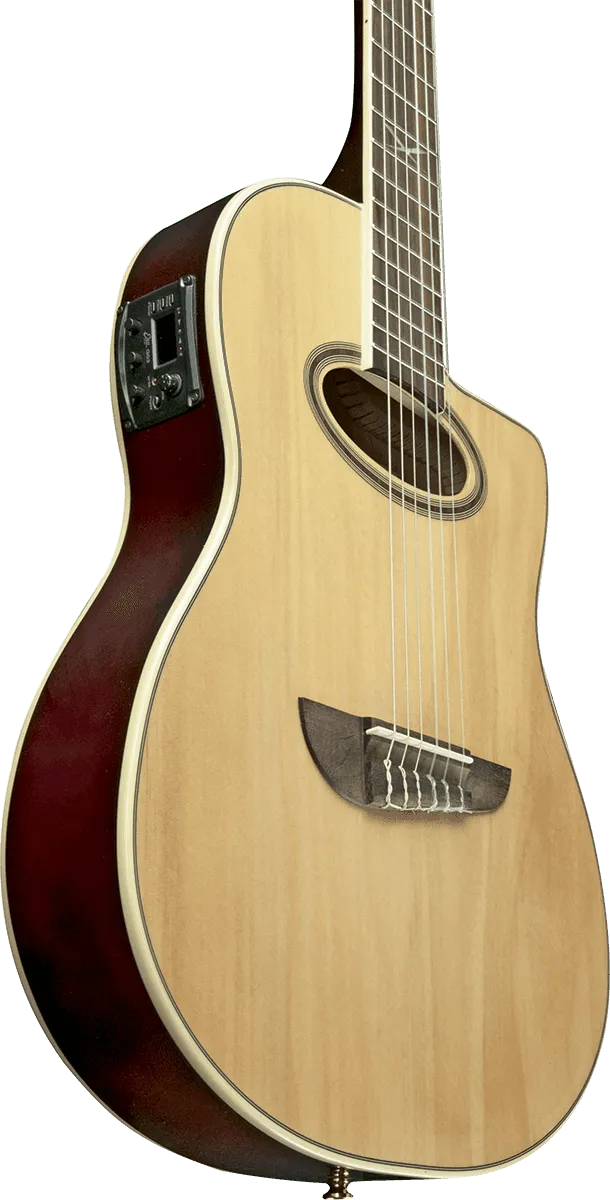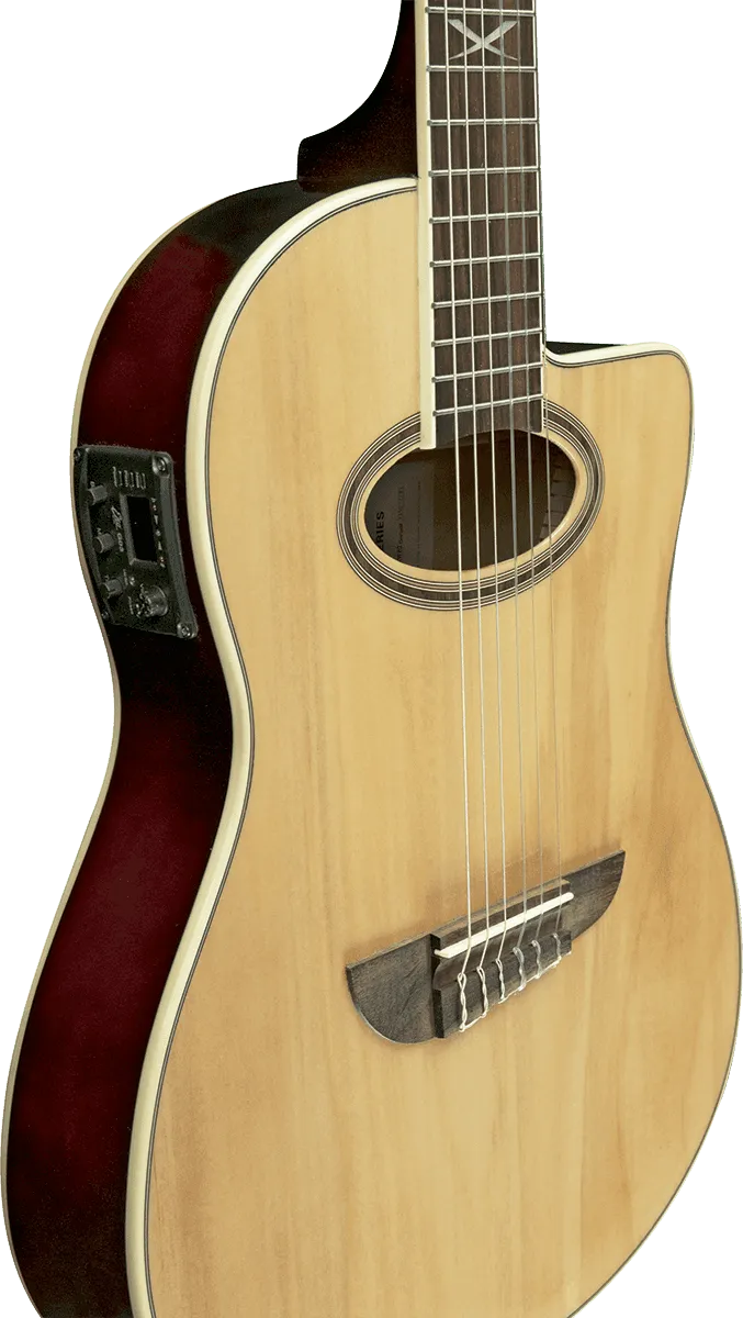 The NXT N100ce is an entry level Nylon guitar that comes with all you need to please your ears and eyes. Great sound and astonishing appearance. NXT Nylon is a mix between an Acoustic, a Gypsy and a Classical guitar: ready to be played standing in Live, with the neck joint at XIV fret to be easily played in the higher part of the neck.