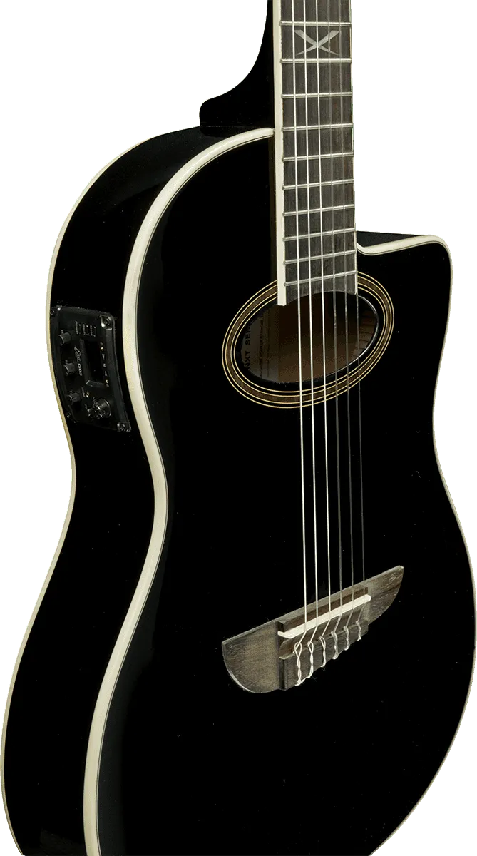 The NXT N100ce is an entry level Nylon guitar that comes with all you need to please your ears and eyes. Great sound and astonishing appearance. NXT Nylon is a mix between an Acoustic, a Gypsy and a Classical guitar: ready to be played standing in Live, with the neck joint at XIV fret to be easily played in the higher part of the neck.