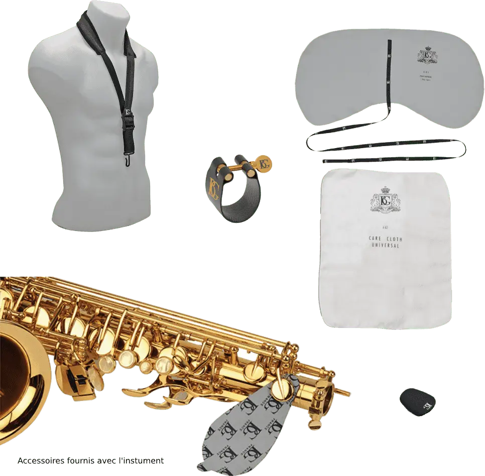 Bb, gold lacquer engraved bell. Adjusting screw on both hands. Double arm on C - B - Bb. Ergonomic left finger table. Metal thumb rest. Vivo bocal.