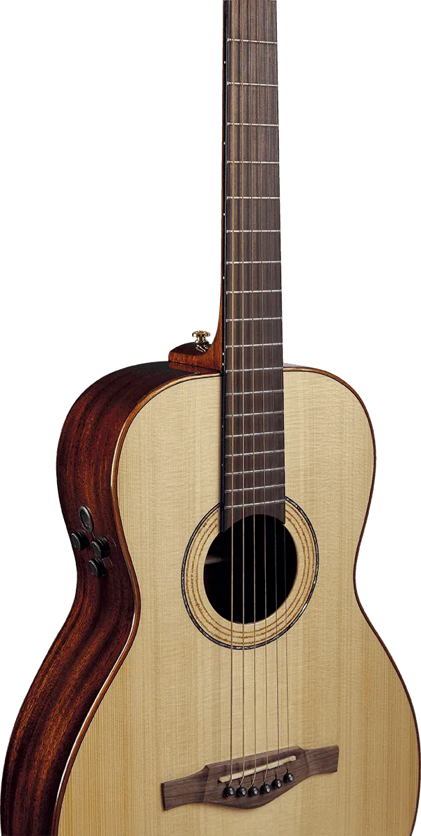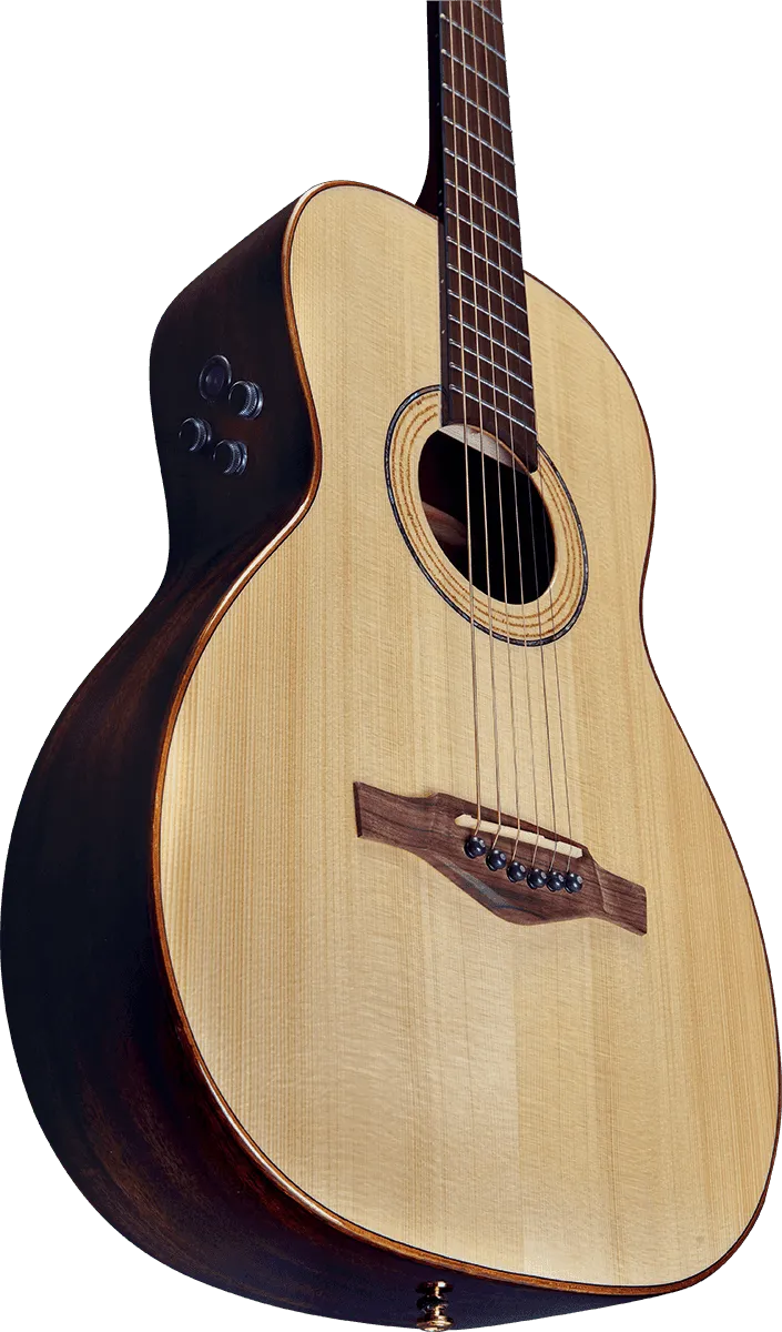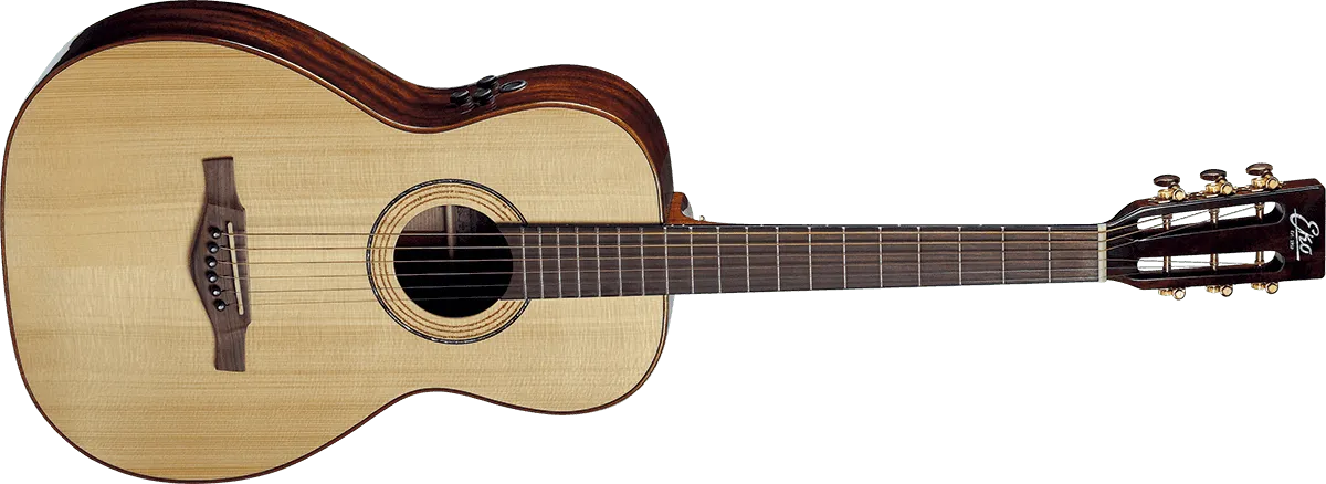 The Marco Polo P500e SM is the electrified All Solid Parlor acoustic guitar by Eko Guitars, with onboard Fishman Flex Blend system. Featuring a Parlor shape with Solid Italian Spruce Top, Mahogany back and sides, Mahogany neck and Rosewood fingerboard, this guitar is well suited for both live performances and studio recording.
