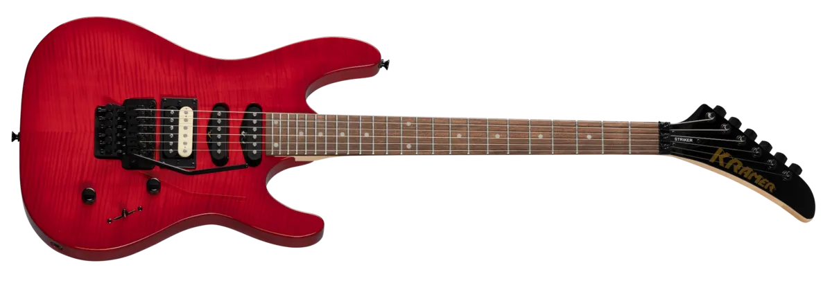 Part of the Modern Collection, the Kramer Striker™ Figured HSS is a gorgeous entry into the high-performance, shred-ready world of Kramer guitars! Along with its stunning, AAA flame maple veneer, it features a satin-finished maple neck with a Kramer K-Speed SlimTaper™ C profile that's fast, easy to play, and incredibly comfortable. Exceptional sonic versatility comes courtesy of a zebra-coil bridge humbucker™ and two single coils, delivering sparkling cleans as easily as harder-rocking tones that can cover a variety of styles. And, of course, the licensed Floyd Rose® locking vibrato provides all the whammy-bar dives and theatrics a true performer needs while keeping in tune.
