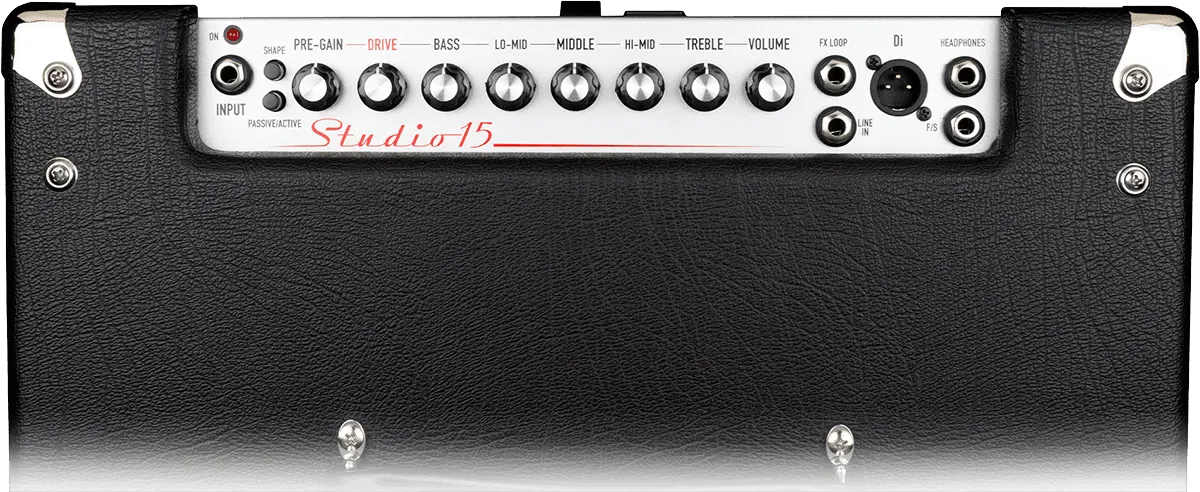 The incredibly stylish Studio 15 delivers 300 watts of premium Ashdown tone through a Custom lightweight 15" NEO speaker. Potent yet portable the Studio 15 comes bursting with great features including foot switchable valve emulated overdrive, XLR DI, FX loop, headphone out, 5 band EQ, Line In and more.