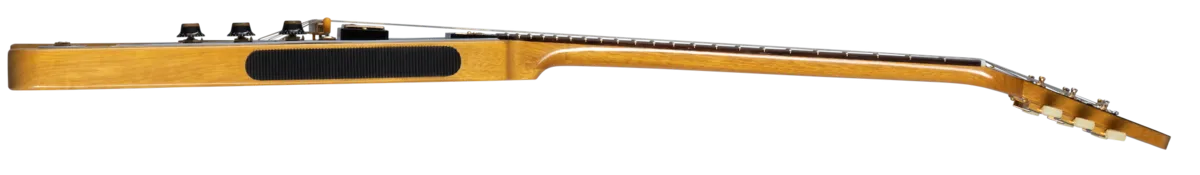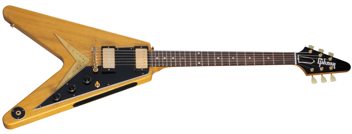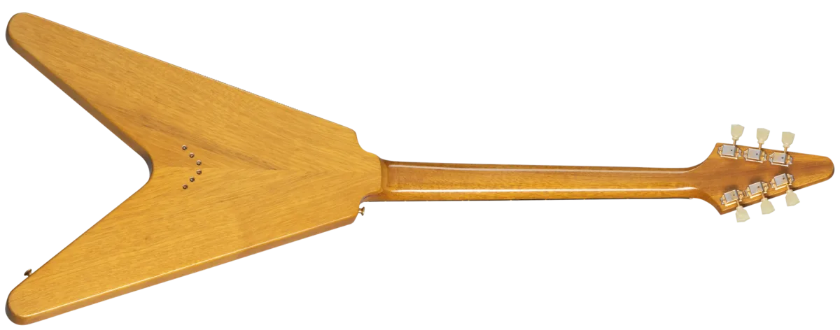 The Gibson Flying V™ was way ahead of its time when it was introduced in 1958, and only 81 were shipped that year, but it has become very popular in the years since then. The classic vintage Flying V features have been carefully recreated in this Historic Reissue model. Featuring an ABR-1 bridge with a string-through korina body, Custombucker pickups, korina neck, Indian rosewood fretboard, two volume and one tone control with CTS® pots and a phone book capacitor, gold hardware, Kluson® tuners, and a 4-ply black pickguard. A historically accurate case is included, with a classic brown exterior and plush pink interior.