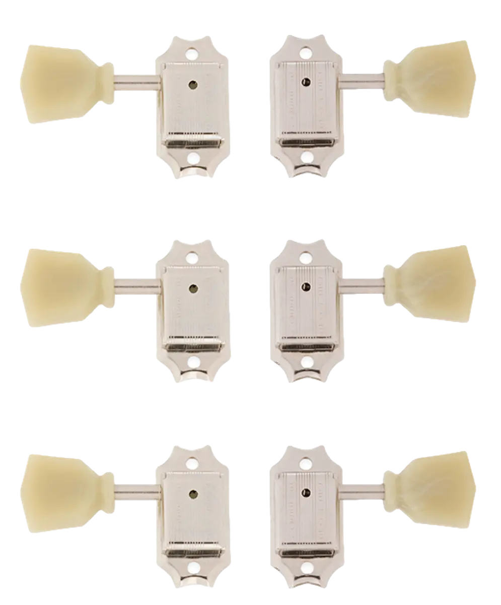 Gibson's vintage Les Paul machine heads with pearloid buttons are manufactured to the same historical OEM specifications as the Gibson tuners of the 1950s. They are made from nickel with push-in bushing machine heads and closed construction housing, adding a classic feel and look to any guitar headstock with exceptional tuning stability and durability. This OEM part is available in Nickel finish.