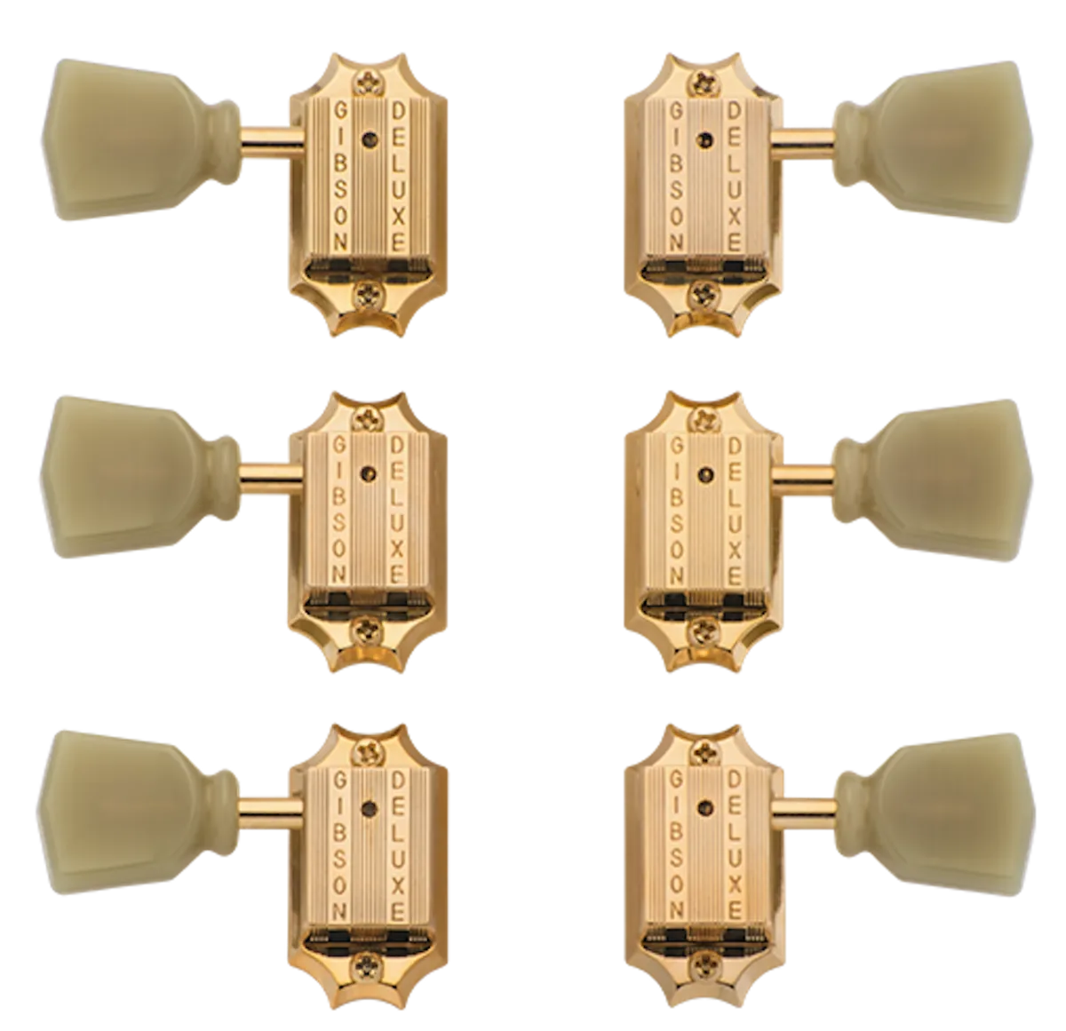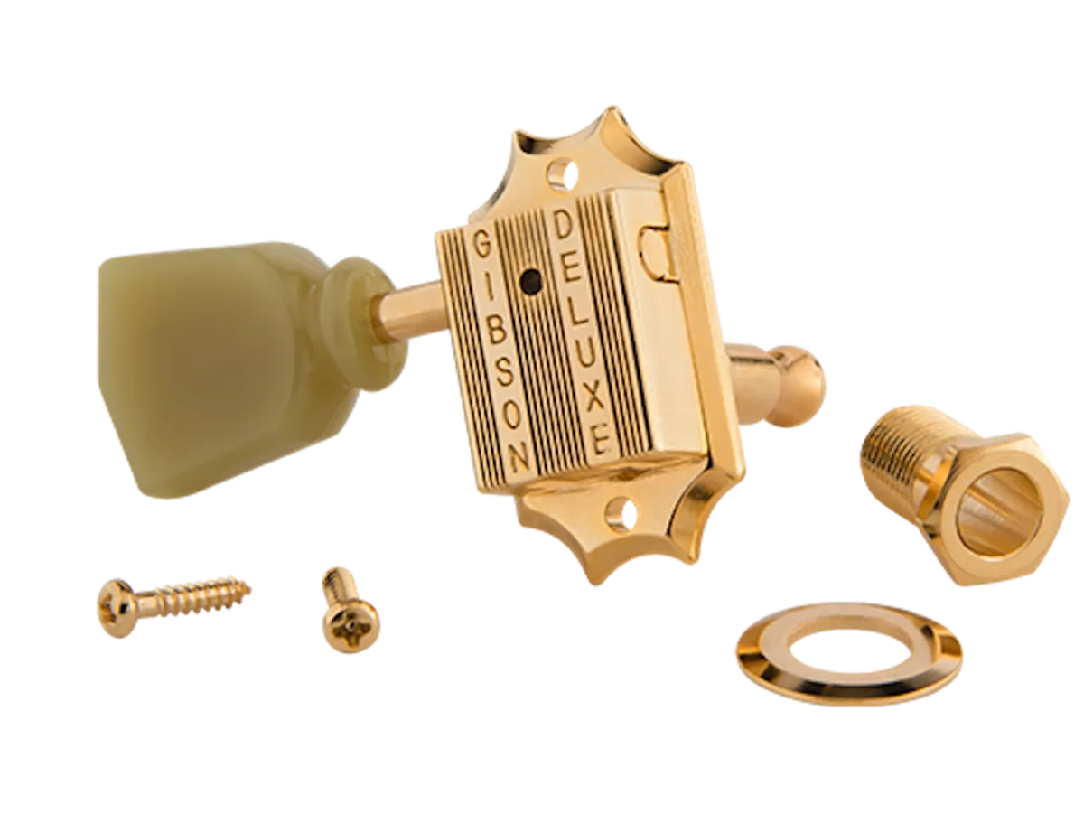 Gibson's vintage machine heads with pearloid buttons feature solid nickel, closed housing construction, period-correct vintage styling, and traditional pearloid buttons that deliver precise tuning, while adding a luxurious, classic feel to your guitar's headstock. This OEM part comes in either Nickel or Gold finish. Special note: These tuners feature screw in bushings, which require a larger diameter mounting hole than traditional 'push in' bushing tuners.