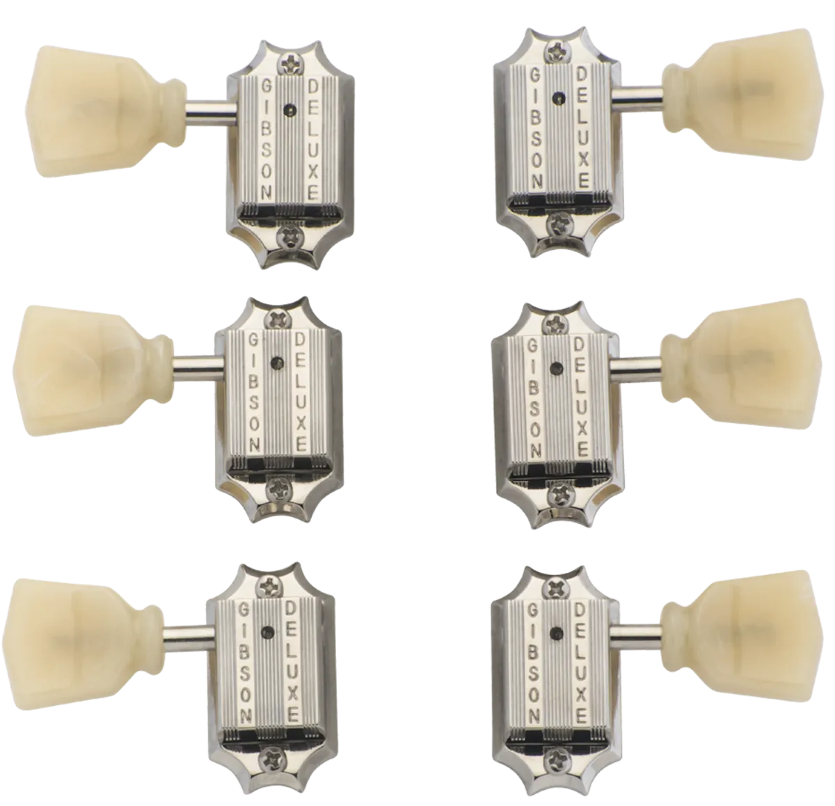 Gibson’s vintage machine heads with pearloid buttons feature solid Nickel, closed housing construction, period-correct vintage styling, and traditional pearloid buttons that deliver precise tuning, while adding a luxurious, classic feel to your guitar’s headstock. This OEM part comes in a Nickel finish. 14:1 Tuning Ratio. Special note: These tuners feature screw in bushings, which require a larger diameter mounting hole than traditional ‘push in’ bushing tuners.