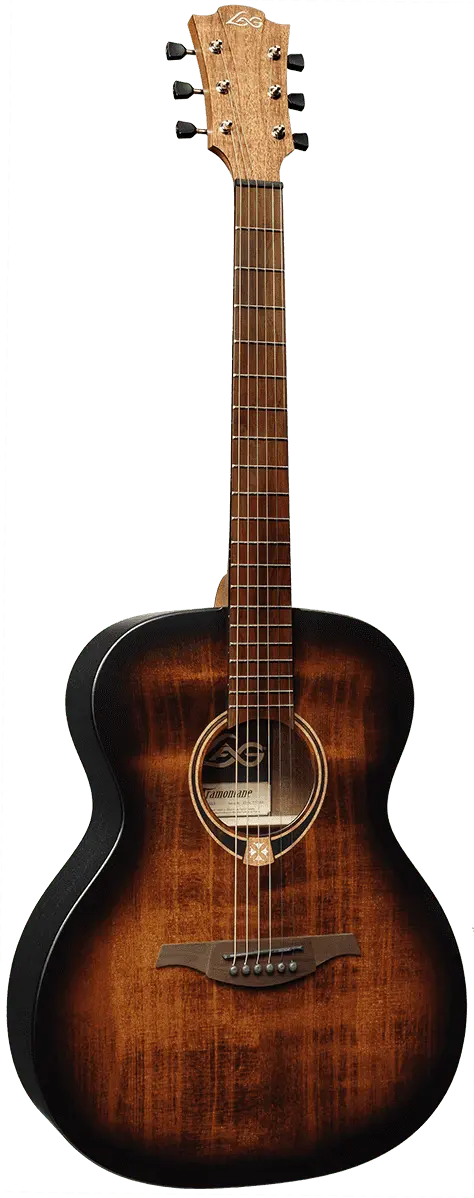 Inspired by Lag's renowned Tramontane series, this guitar showcases elements such as mirrored headstock and bridge shapes made from BrankoWood. The addition of black tuning pegs and elegant body bindings emphasizes its unique and comfortable appearance.