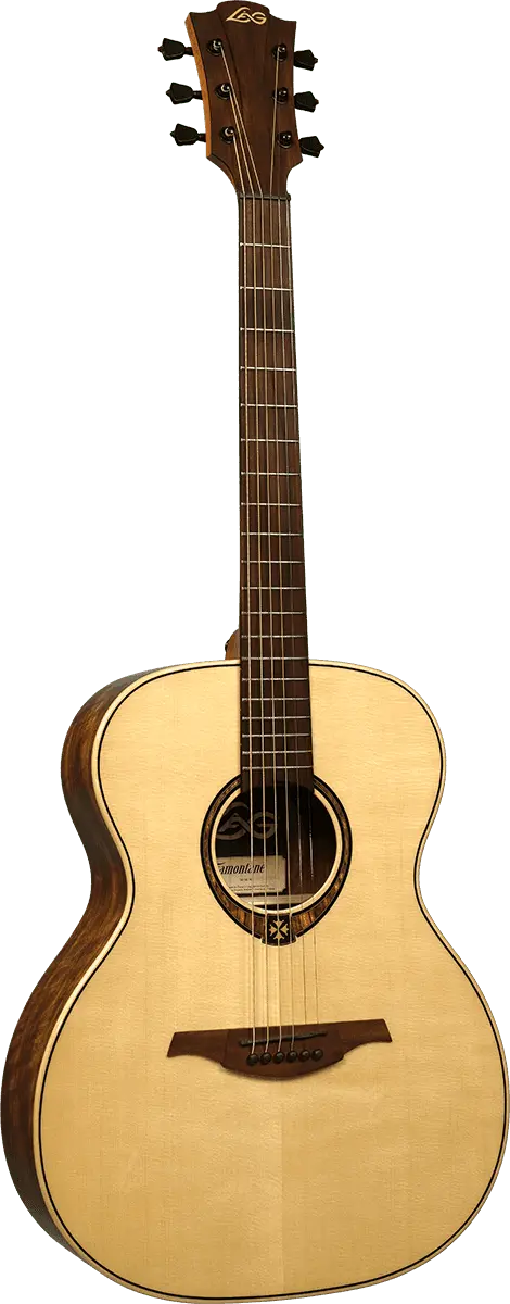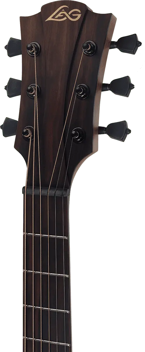 The Lâg T318A features an auditorium body shape, a versatile design that provides a rich tonal palette suitable for various playing styles.