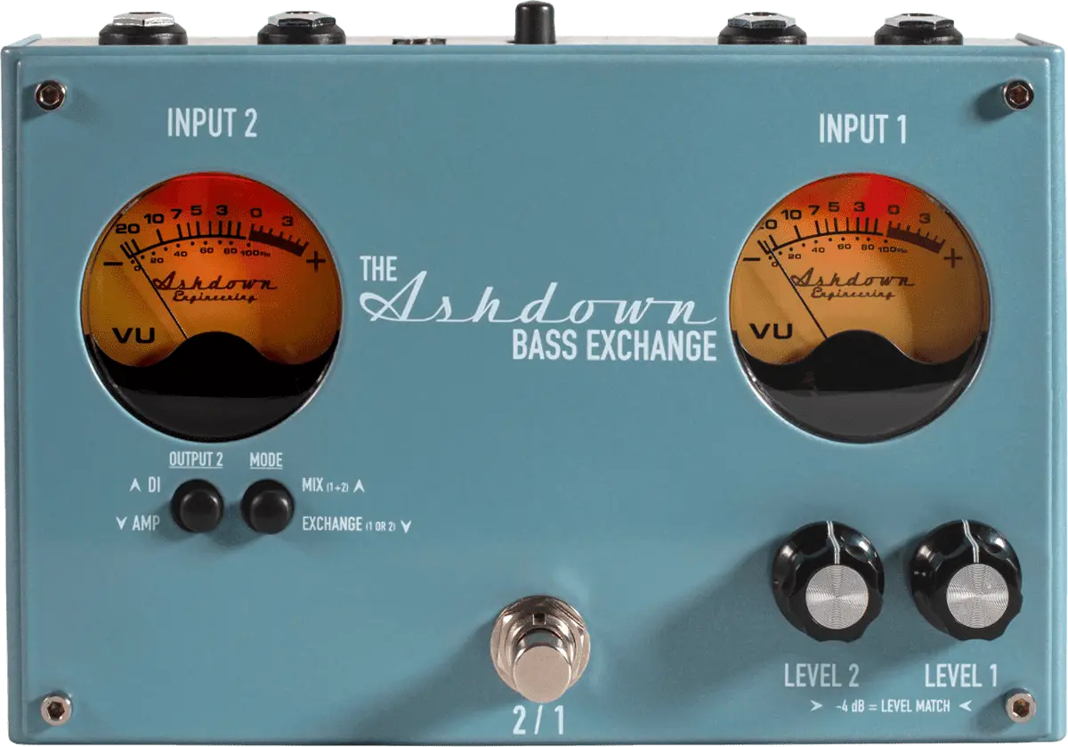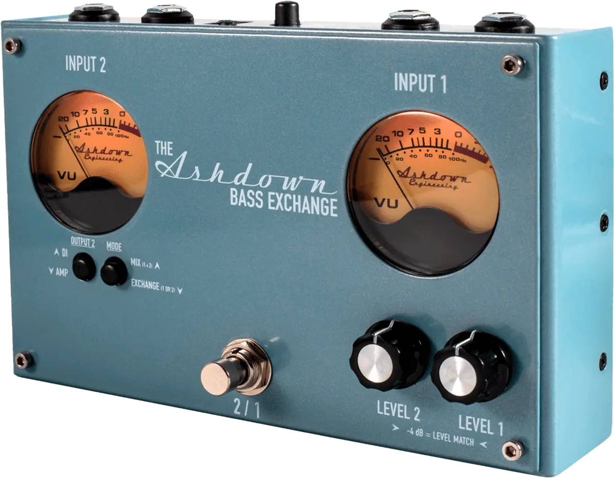 The Bass Exchange is a bass players dream for any musician on the road with 2 instruments or 2 Amps. With independent input gains and our trademark VU meter, setting the exact volume for each instrument is a breeze.