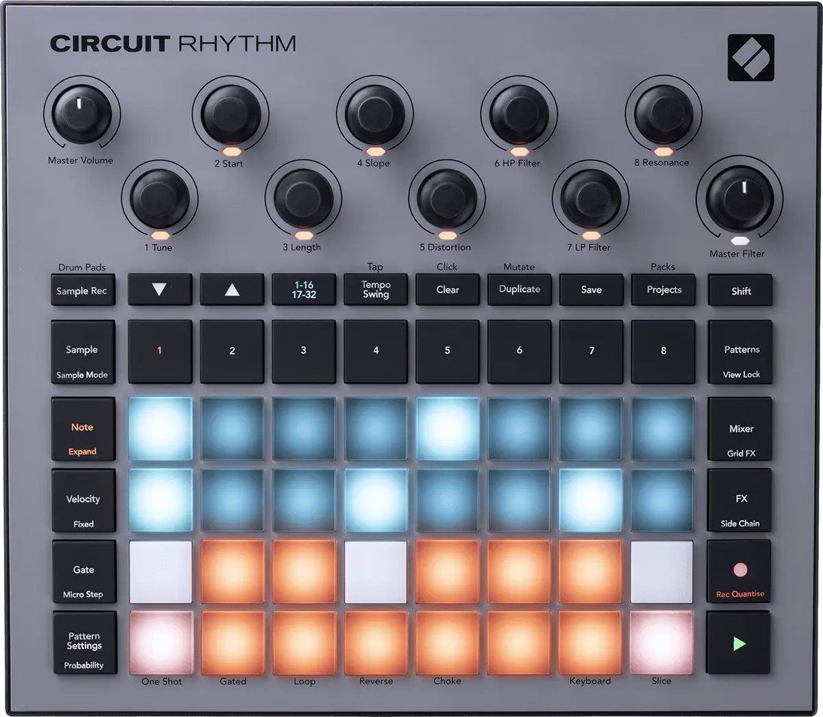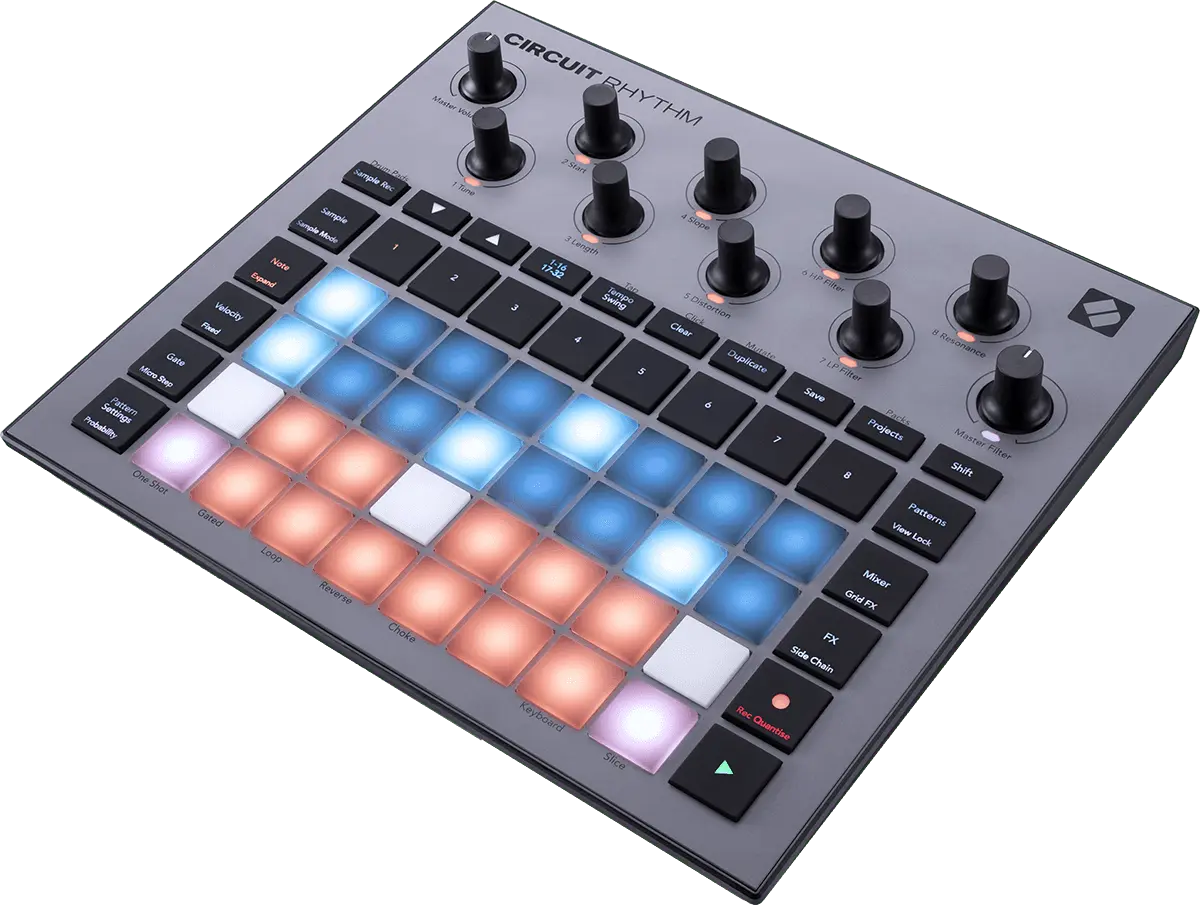 Circuit Rhythm is a versatile sampler for making and performing beats. Record samples directly to the hardware, then slice, sculpt and resample your sounds effortlessly. Capture your groove quantised or off-grid into the sequencer, and layer up across eight sample tracks. Invigorate your live set with performance FX: embrace imperfection with lo-fi tape, stutter your mix with beat repeat, and more. Integrate Circuit Rhythm into your studio, or unplug and create anywhere utilising the built-in rechargeable battery.