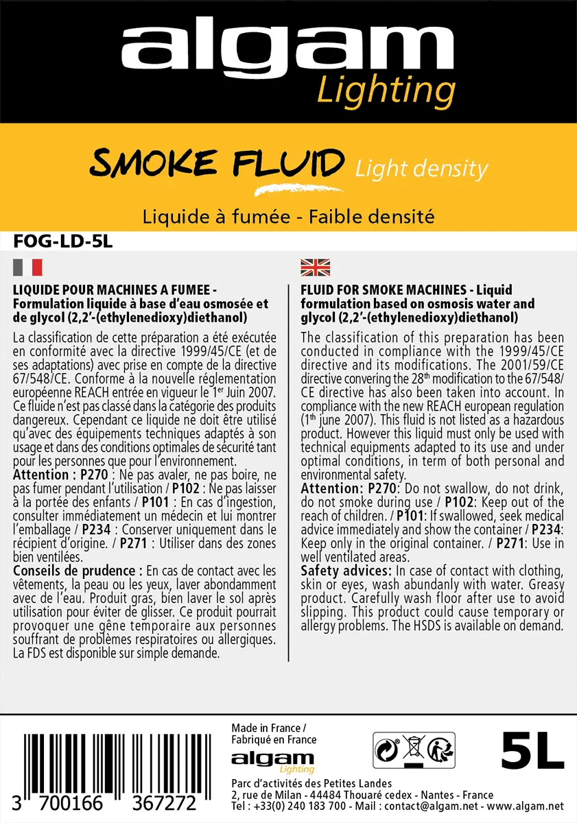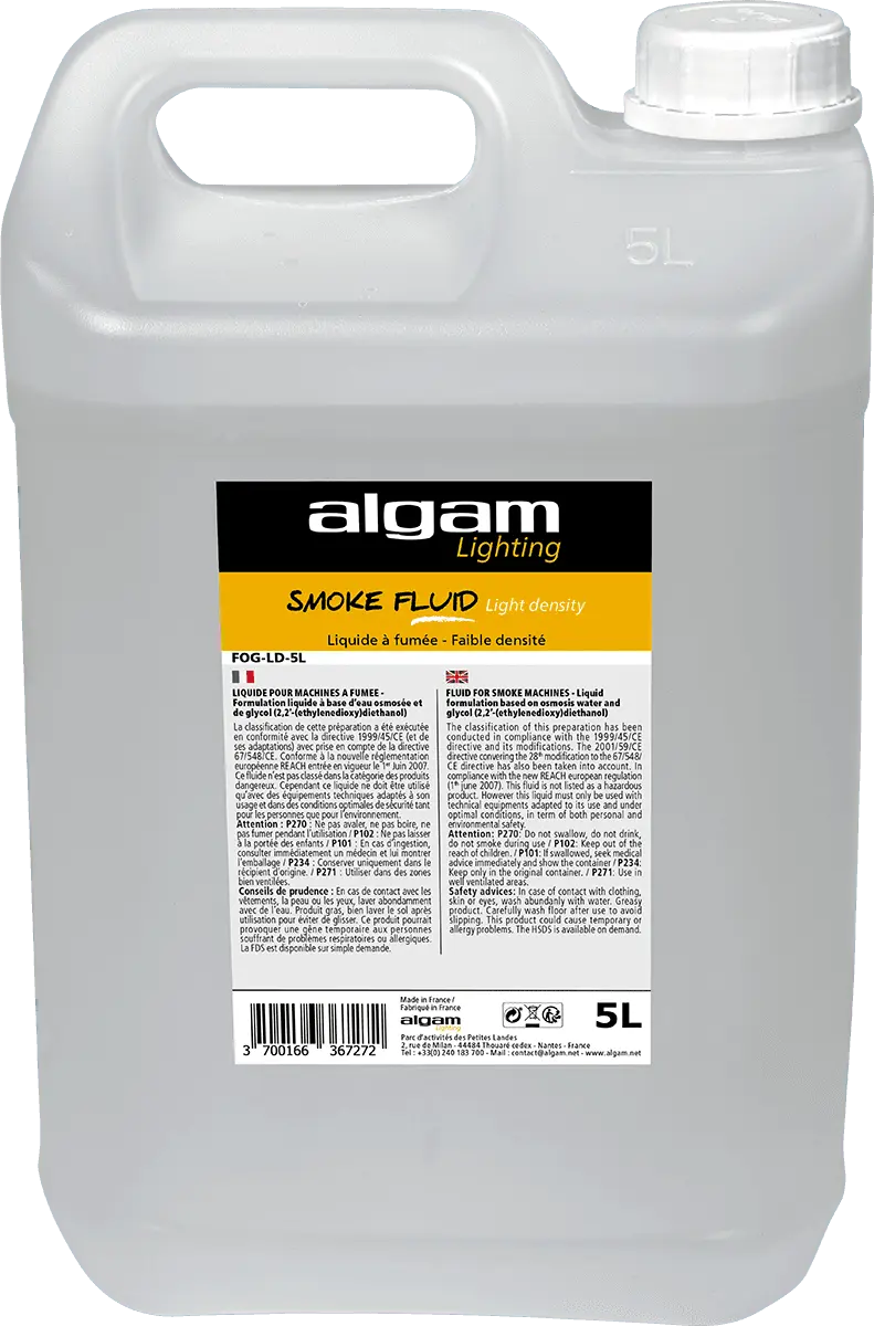 Fluid for low-density smoke, which will dissipate fairly quickly. Ideal for small volumes or to create a slightly foggy atmosphere, while enhancing light shows. Algam Lighting fluids are manufactured in France according to an extremely strict process, in compliance with all the legal standards for these products. Reliable and efficient, Algam Lighting fluids are compatible with most machines on the market.