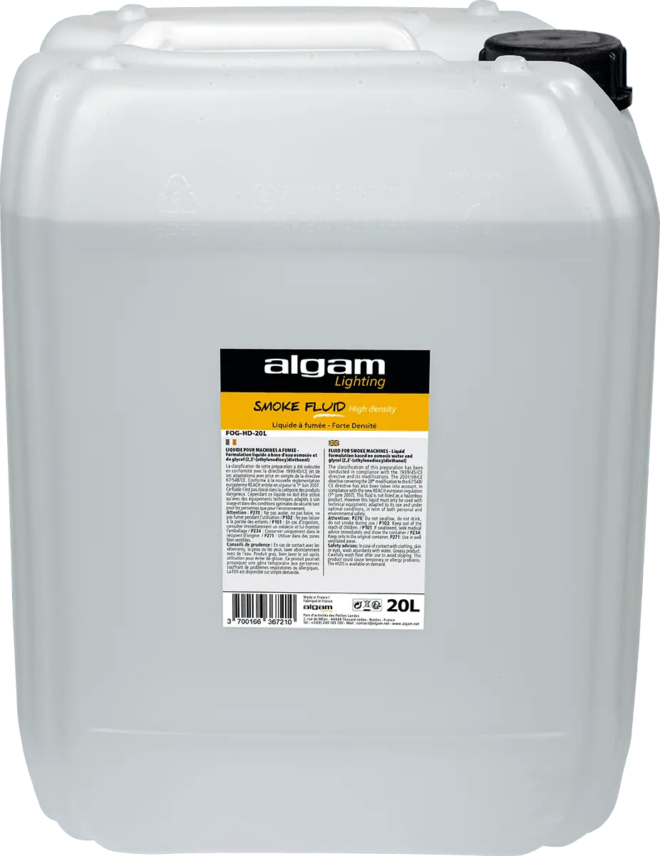 High-density fluids produce a compact and uniform smoke; they will be ideal for an actual permanent foggy effect in large spaces, thanks to their increased stability. Algam Lighting fluids are manufactured in France according to an extremely strict process, in compliance with all the legal standards for these products. Reliable and efficient, Algam Lighting fluids are compatible with most machines on the market.