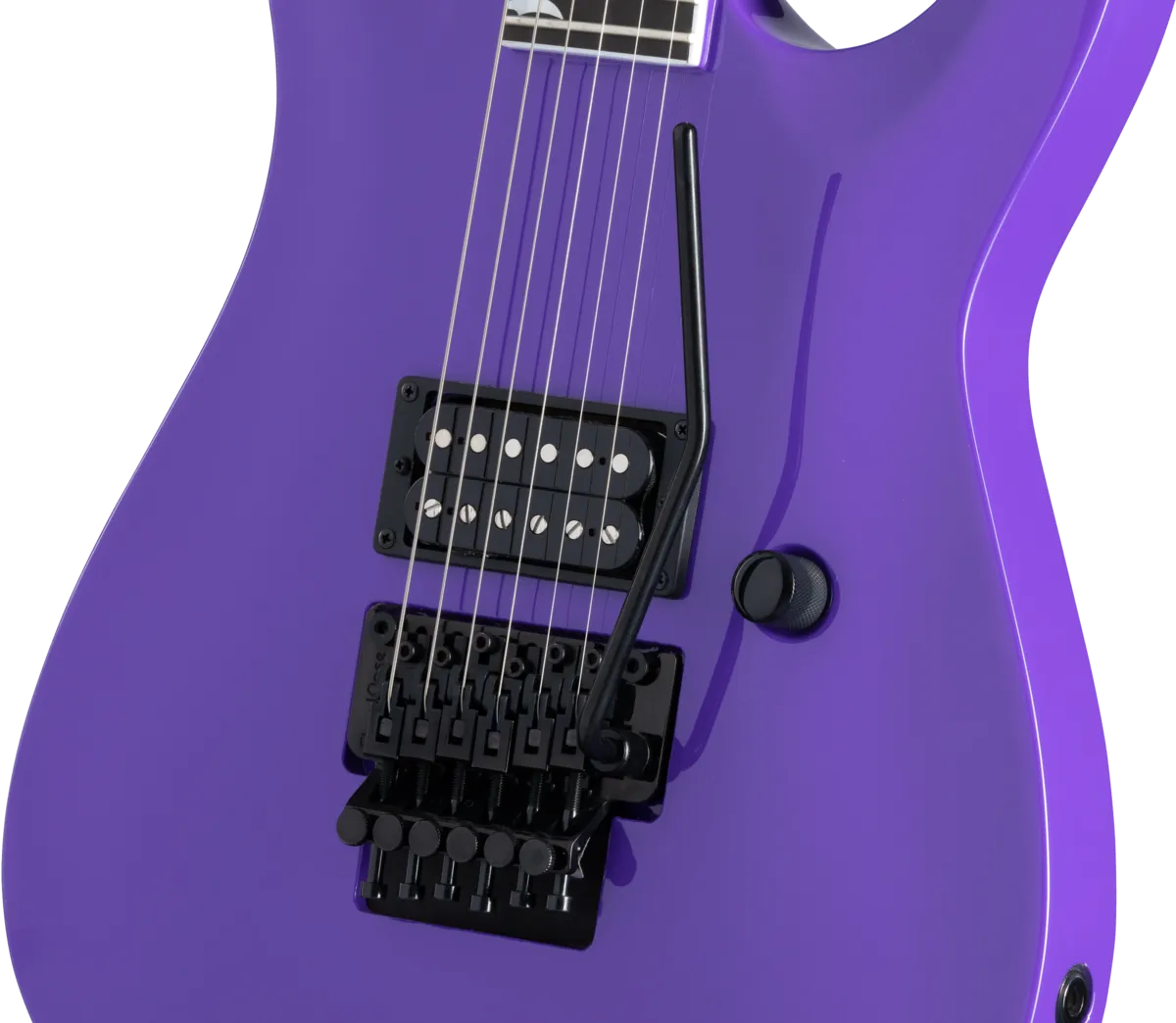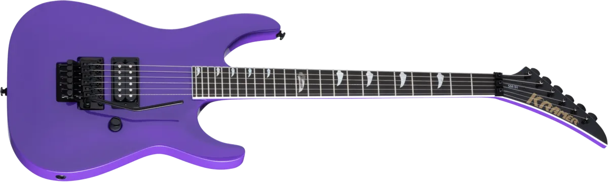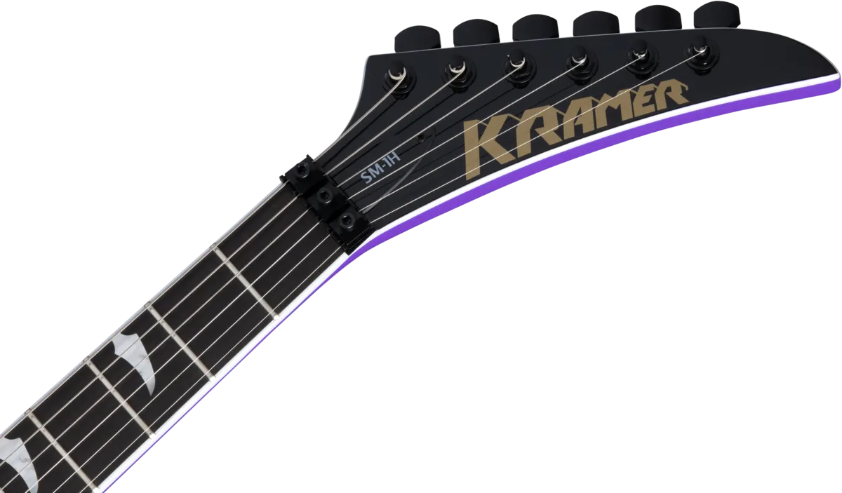 The SM-1 H is an exciting new version of the SM-1 and an updated version of the original Kramer Stagemaster Mach II. It retains the neck-through, double-cutaway mahogany body, ebony fingerboard, and Floyd Rose® 1000 series tremolo and R2 1000 series locking nut of the original SM-1, but has simplified electronics consisting of a single volume control with push/pull series/parallel switching and a Seymour Duncan® JB™ humbucker™ in the bridge position. Available in Buzzsaw Gold, Shockwave Purple, and Tronius Silver.
